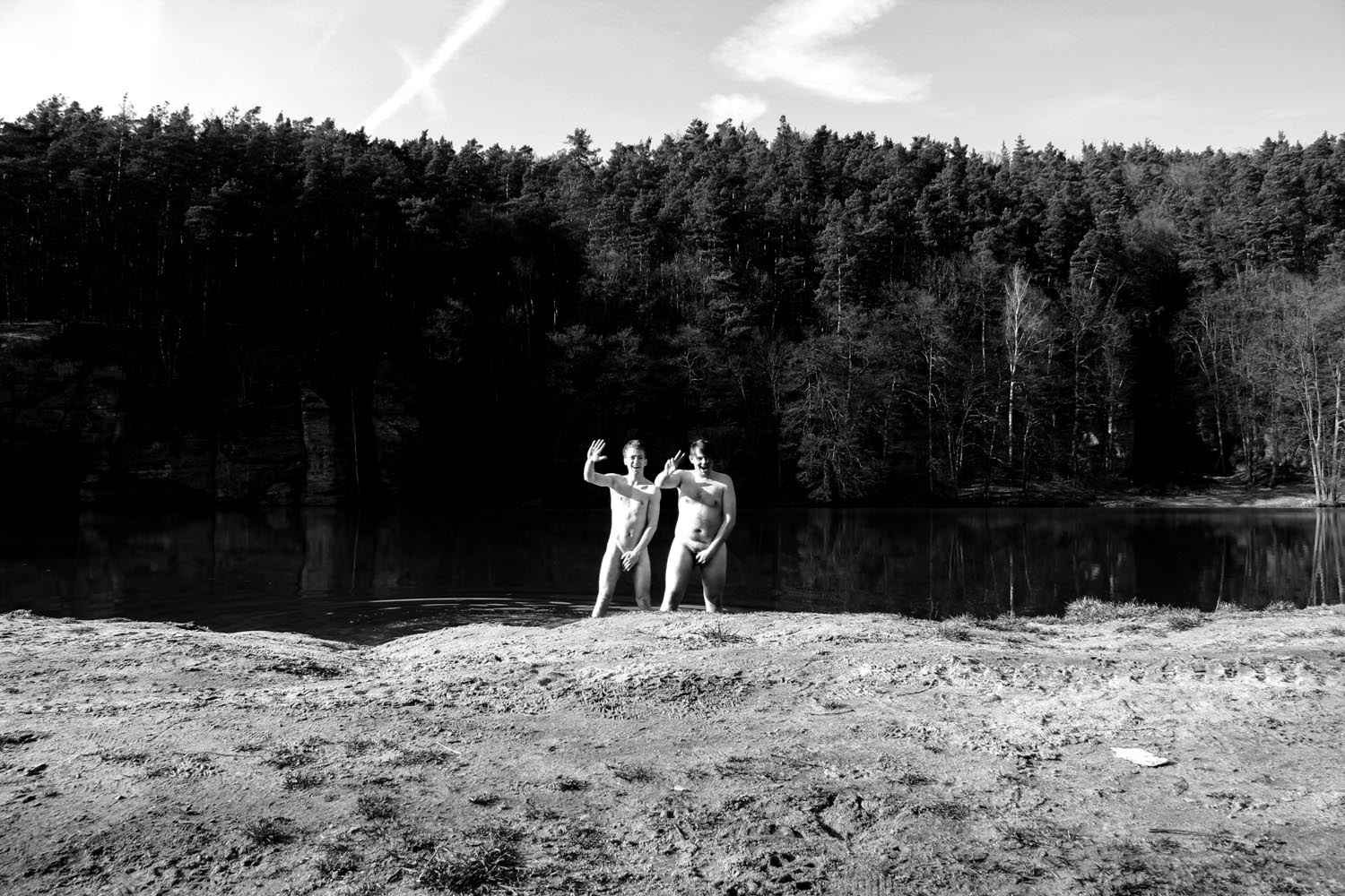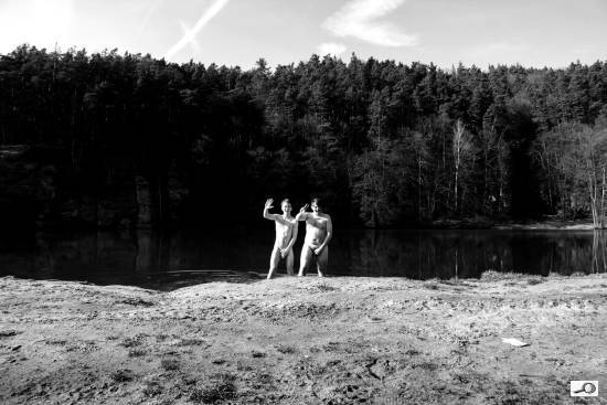 Jednou jsme se rozhodli udělat si výlet na hrad a do přírody. Samozřejmě jsme doma nenechali aparáty. Bylo relativně hezké počasí a tak nás napadlo se poprvé tento rok vykoupat. Člověk něco takového ovšem dopředu neočekával a tak jsme neměli plavky. Foceno z lavičky na samospoušť a vůbec jsme nevěděli jestli se ta fotka povede. Snad to nikoho příliš nepobouří.