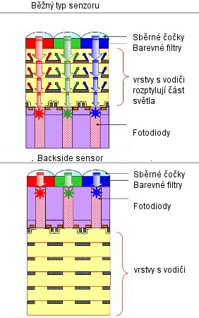 Princip je vyjádřen schematem zde vpravo. Snímač sestává ze čtyř základních vrstev. Zcela nahoře jsou sběrné čočky, pod nimi filtry (Bayerova mřížka) se základními barvami RGB, tedy červenou, zelenou a modrou. Díky jim můžeme vytvářet barevné fotografie. Následuje vrstva vodičů, tedy především sběrnic vygenerovaného elektrického náboje. Ten se generuje ve fotodiodách pod vodiči. Na schematu je vidět, že světlo prochází jakousi studnou a fotodiody jsou někde hluboko dole. Takto je řešena front side ilumination, tedy osvětlení zpředu. Backside ilumination má přehozené vrstvy s vodiči a s fotodiodami. Ty jsou hned pod filtry. Bezprostřední výhodou nového typu je větší energetický zisk. Celkem logicky, fotony které se v kalsickém snímači cestou poztrácejí, zde dopadnou do fotodiody a přemění se v elektrony. Takže zisk je údajně dvojnásobný, takže snímač je fakticky, fyzicky dvakrát citlivější. Více si o tom můžete přečíst na stránce Sonyho, kde najdete dokonce animované schémátko a ukázky fotek jeho Exmor R snímače. |