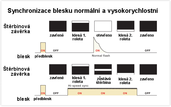 Předblesk, to je měrný blesk, který je odpálen a čidlo měří světelnou odezvu a podle ní dávkuje sílu provozního záblesku. První situace zachycuje funkci závěrky a blesku v dlouhém čase. Nejdřív je průchod k čipu zavřen první roletou, ta klesá, na okamžik je čip celá obnažen a do toho proniká záblesk. Ten skončí a začne klesat druhá roleta, až průchod zavře. Druhá situace začíná zase předbleskem, klesá první roleta, ale to už práská první dílčí provozní záblesk, následuje další, proniká štěrbinou a vše dokončí ten poslední, který vnikne na čip dřív než druhá roleta klesne a zavře průchod.