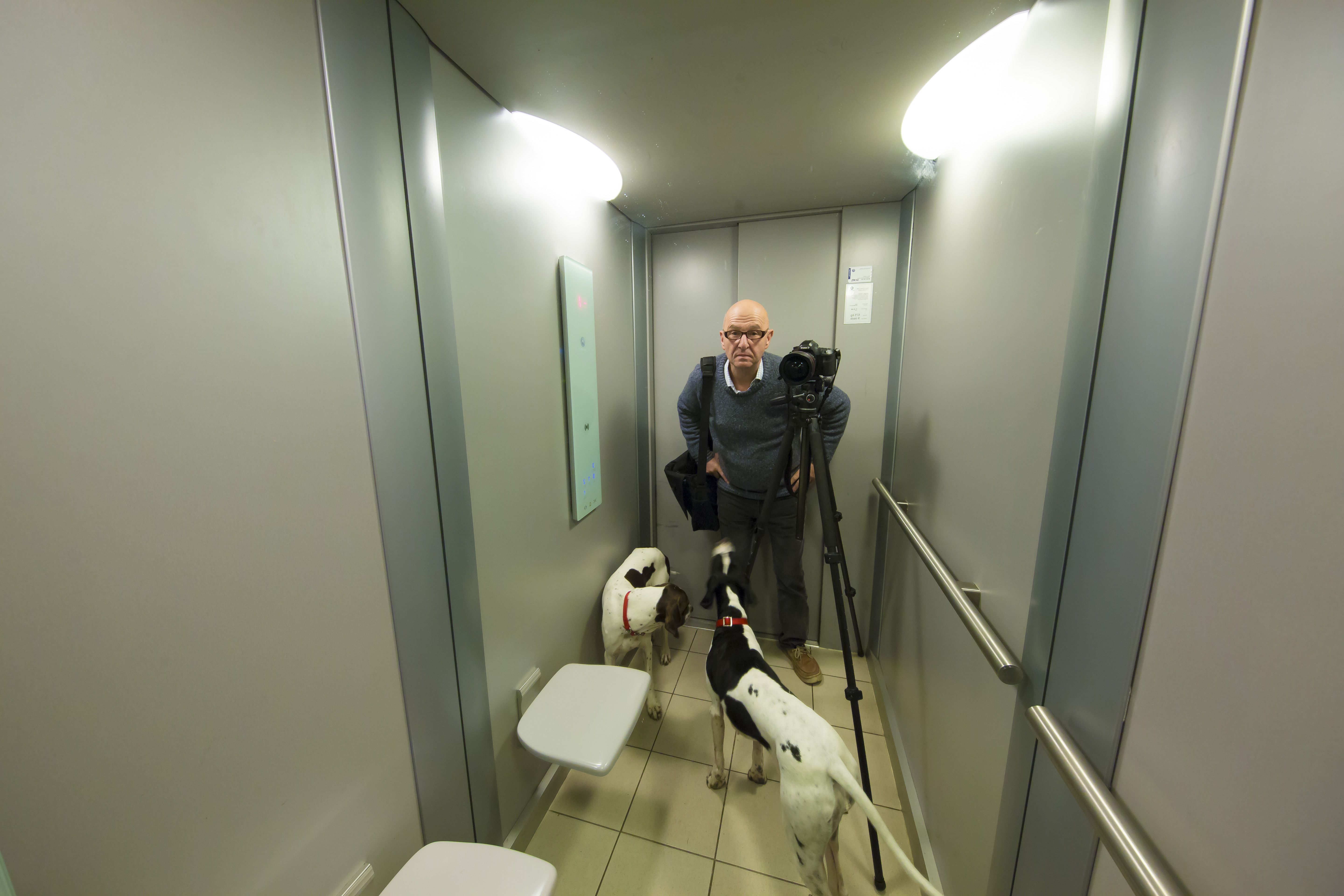 No a zde je ukázka, jak ta šíře vypadá v praxi. Jistě jste někdy jeli výtahem… takhle jsem se v něm vyfotil s oběma pejsky.