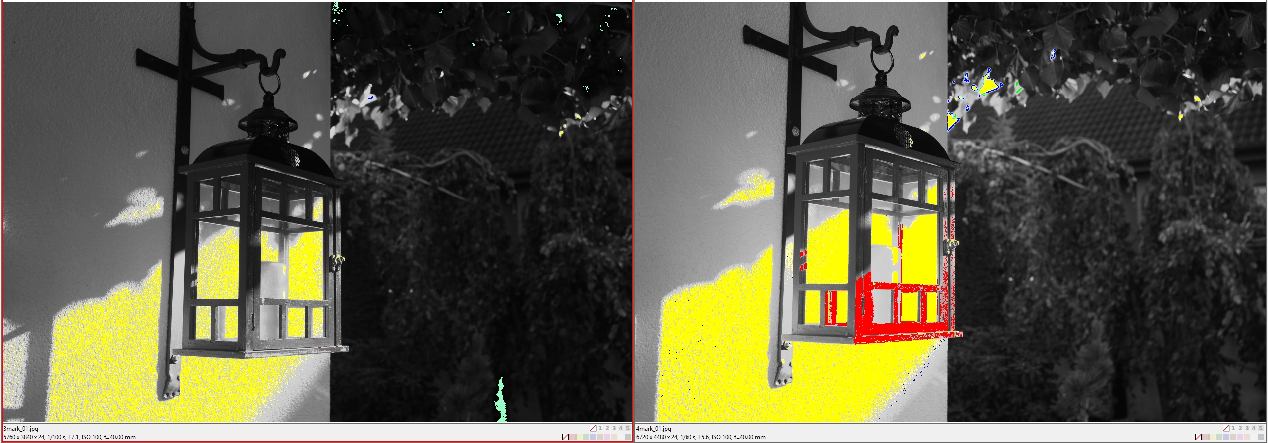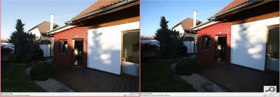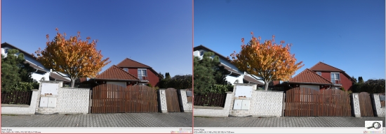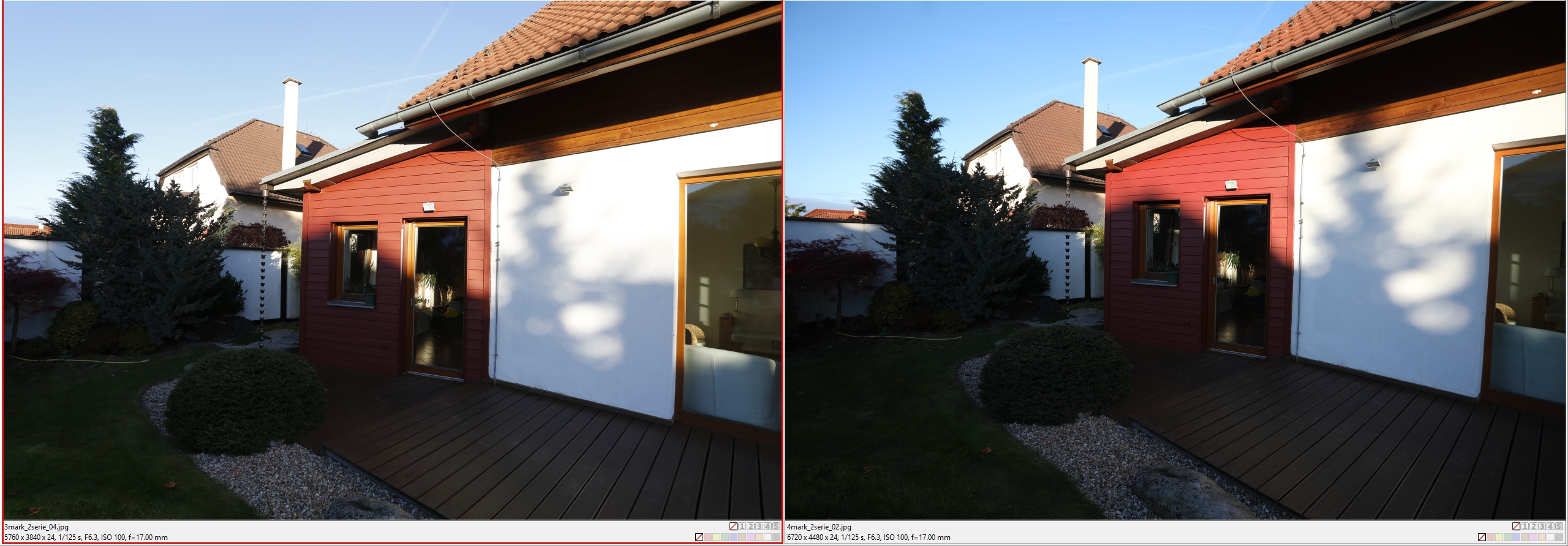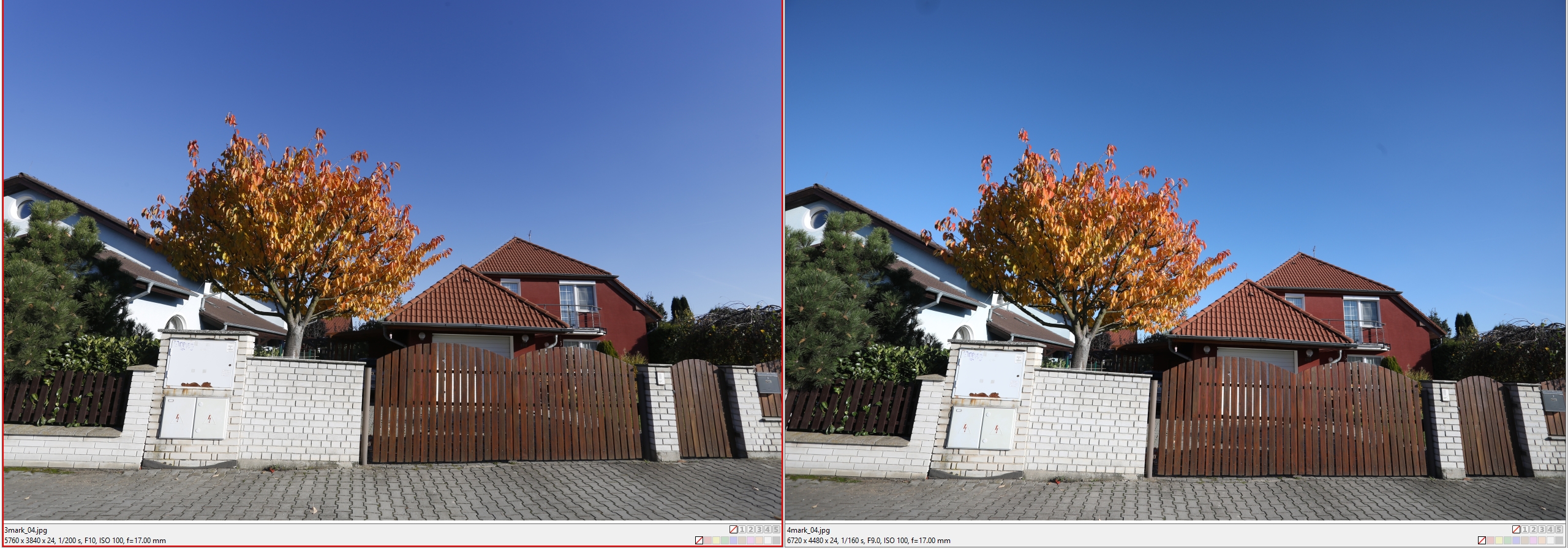 Zajímavé je toto srovnání, vlevo trojka, vpravo čtyřka. Přestože je expozice shodná, je obrázek ze čtyřky očividně tmavší a temnější je i nebe.