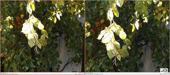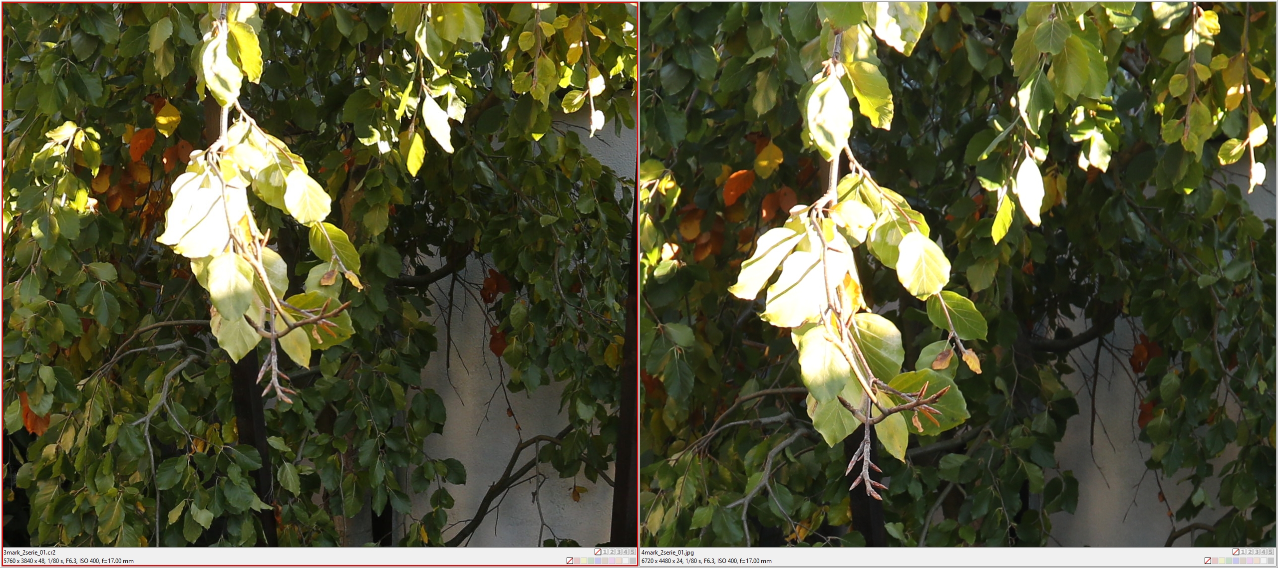 V druhé série srovnávacích zkoušek jsem fotil v manuálním režimu, abych eliminoval vliv automatiky. Zajímala mě zejména schopnost vykreslit jak jasy, tak stíny, tedy dynamický rozsah. První dvojici jsem fotil za prudkého slunce, větvička s listy je ostře nasvícena na hodně temném pozadí. Ona přístroje prokázaly přepaly a ty jsou v podstatě identické v obou případech.