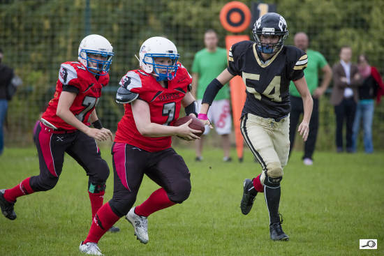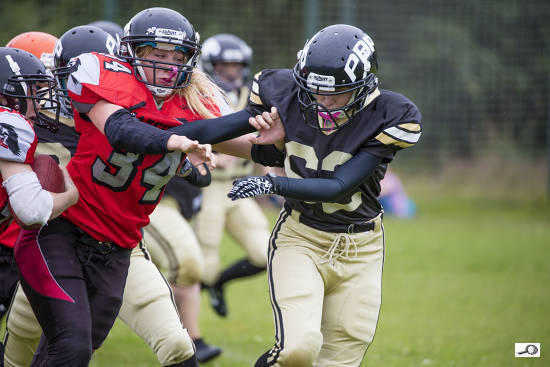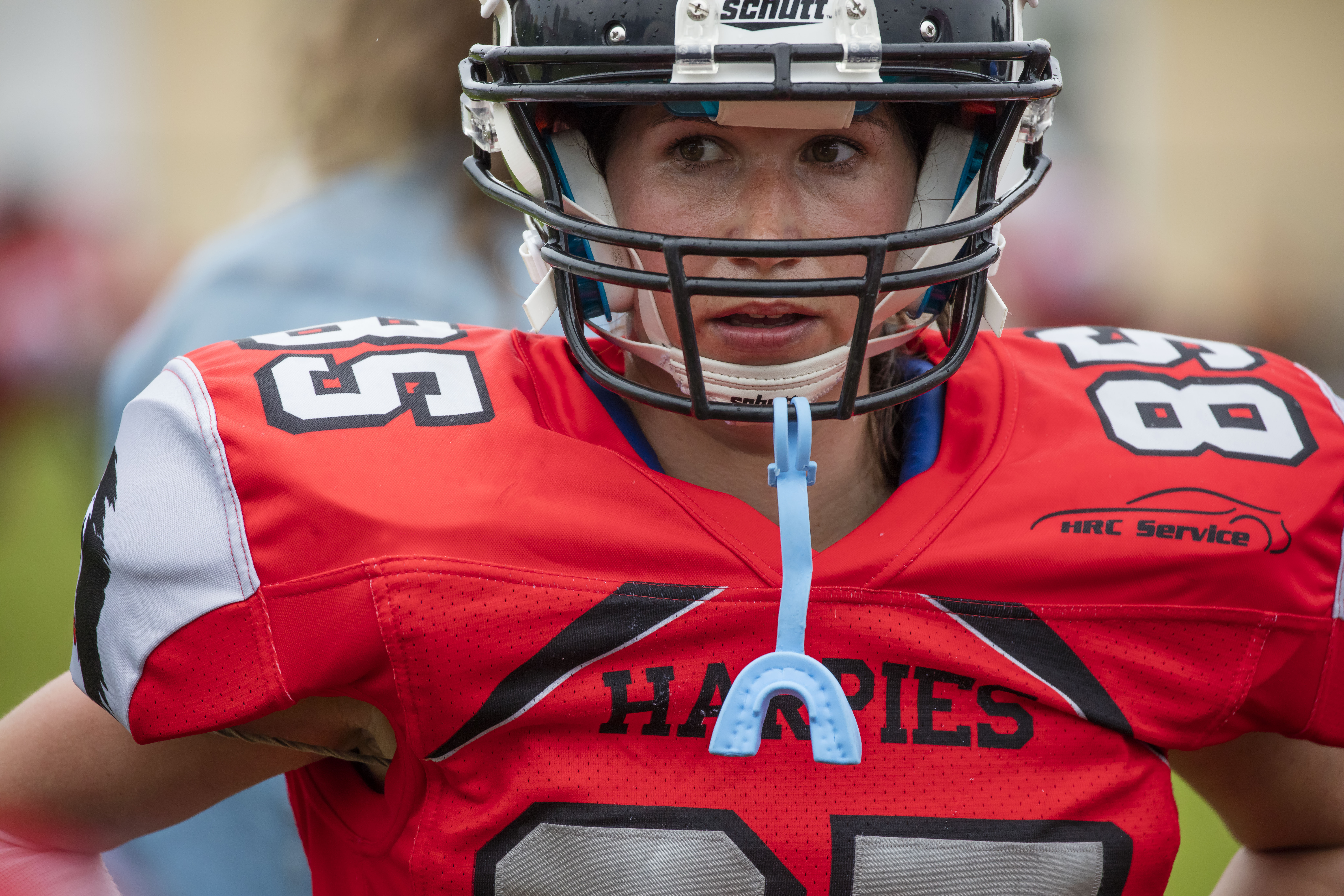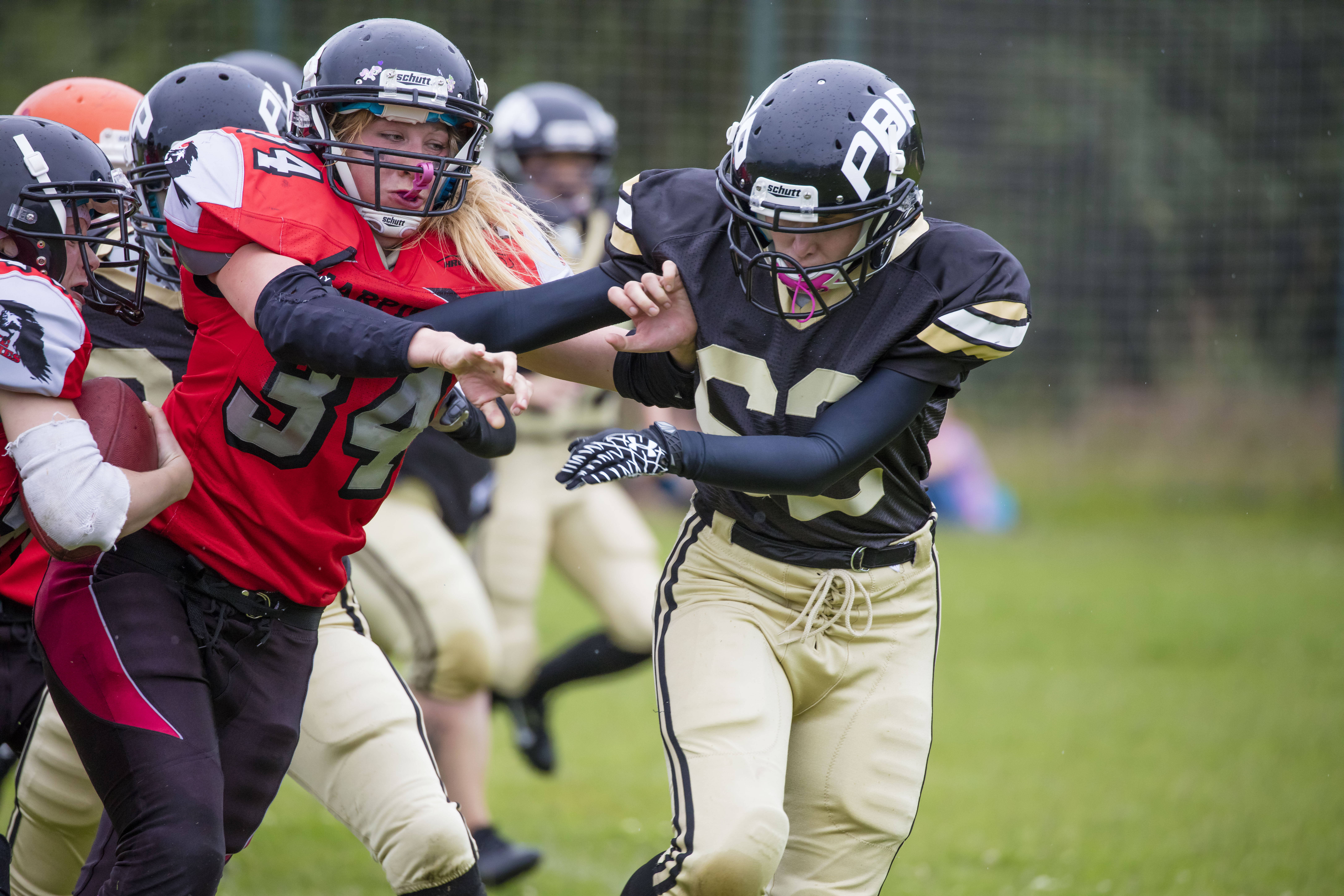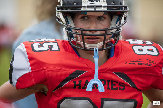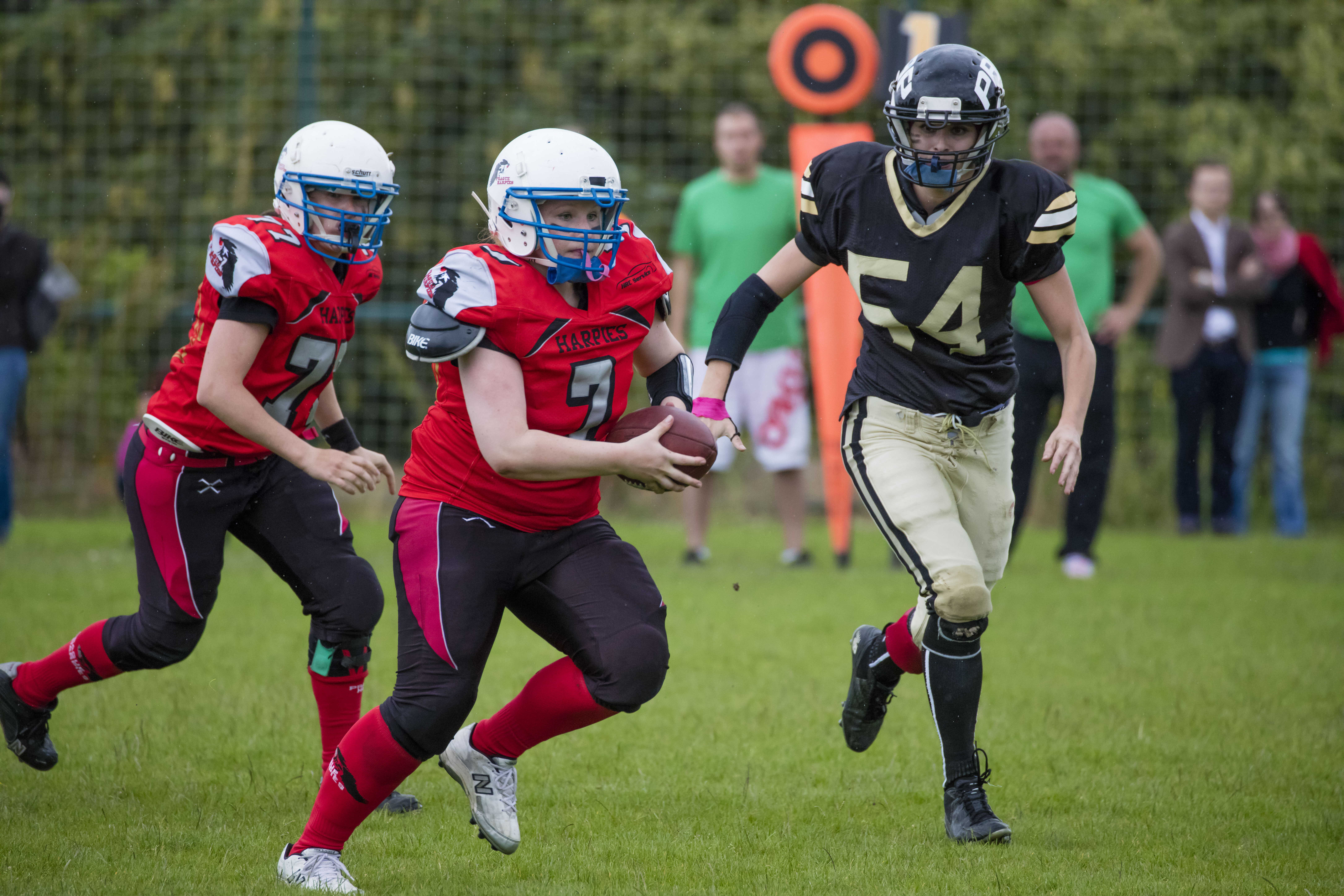 Druhé kolo jsem si dal na zápase dívčích týmů amerického fotbalu Harpies proti Black Cats. Tentokrát dokonce pršelo, takže bílé tečky které možná na fotce objevíte nejsou žádné vady čipu, ale dešťové kapky.