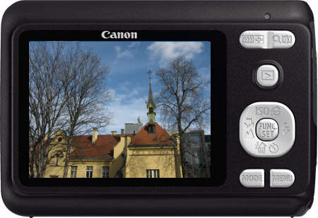 Uprostřed čtyřcestného voliče je potvrzovací tlačítko a funkční menu v typickém canonském uspořáídání: vlevo podél displeje se otevře lišta a na ní volíme (shora) expoziční kompenzaci, vyvážení bílé, živost barev, režim měření poměrový/středový/bodový, dále snímání jednotlivých obrázků /sérii, dále kompresi a velikost obrazu. Protože je přístroj jednoduchý, nenajdeme tu “opičky”, tedy roztodivné nastavování uvítacích obrazovek a podobné legrácky, známé z vyšších tříd komapktů Canon.