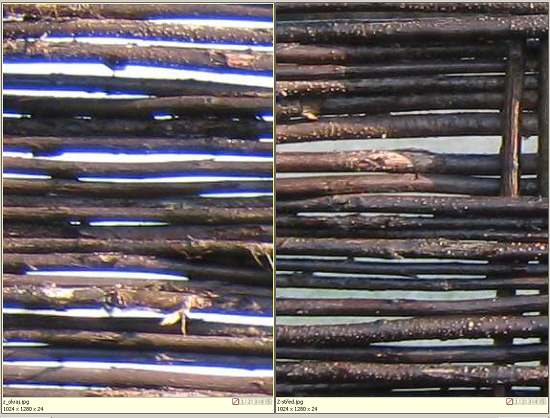 Vlevo je výřez z okraje obrázku, vpravo z jeho středu. Kresba ustoupila jen nepatrně, zato aberace na přechodu temných a světlých je patrná. K lepším vlastnostem patří minimální soudková vada (dole vlevo) a snesitelný šum při 800 ISO (vpravo):
