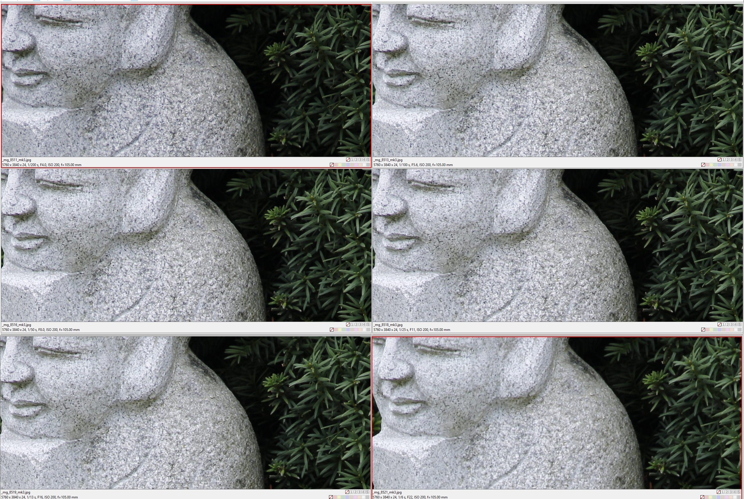 Ke stejnému závěru dospějeme srovnáním obrázků při různých clonách na dlouhém konci zoomu, na ohnisku 105 mm: