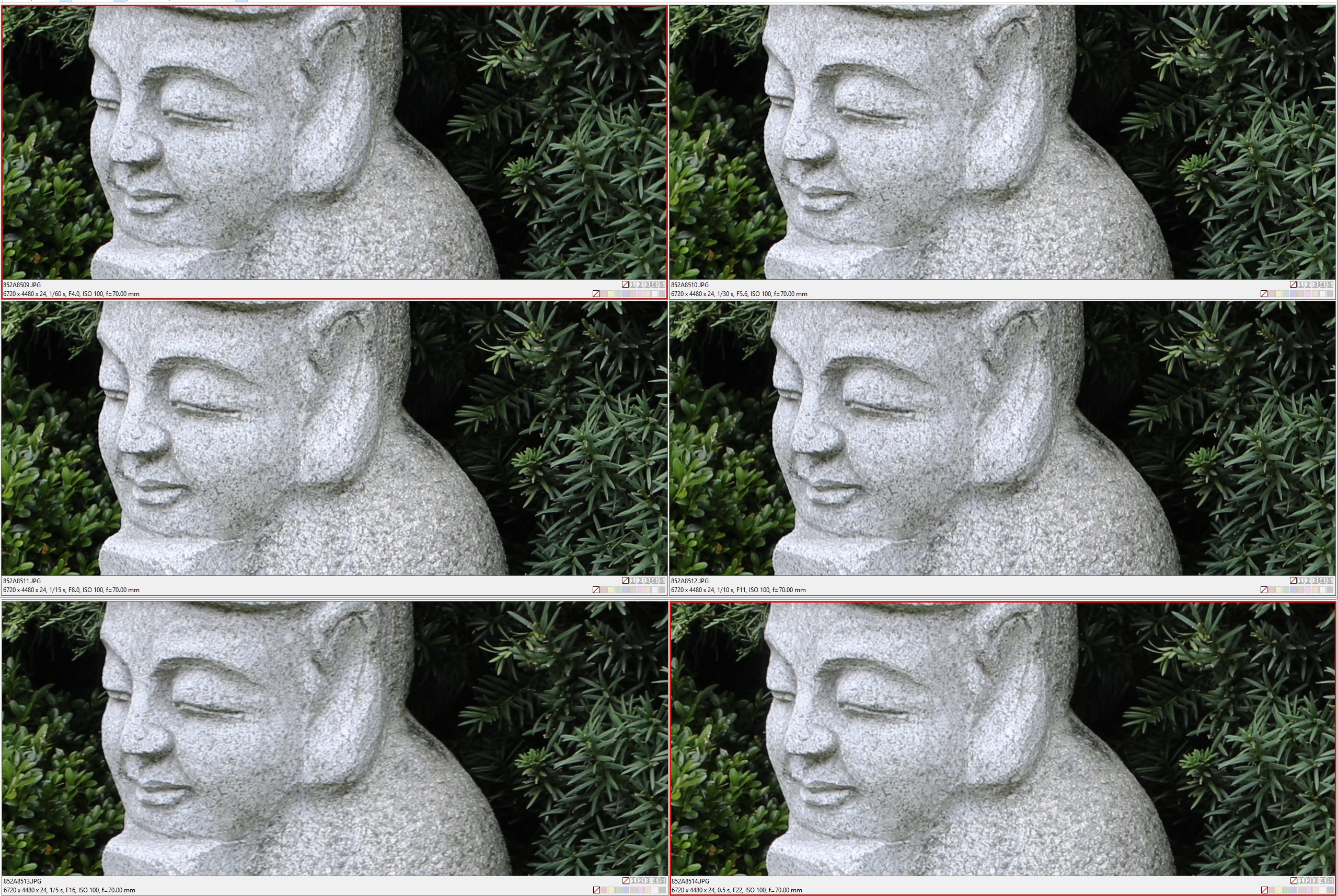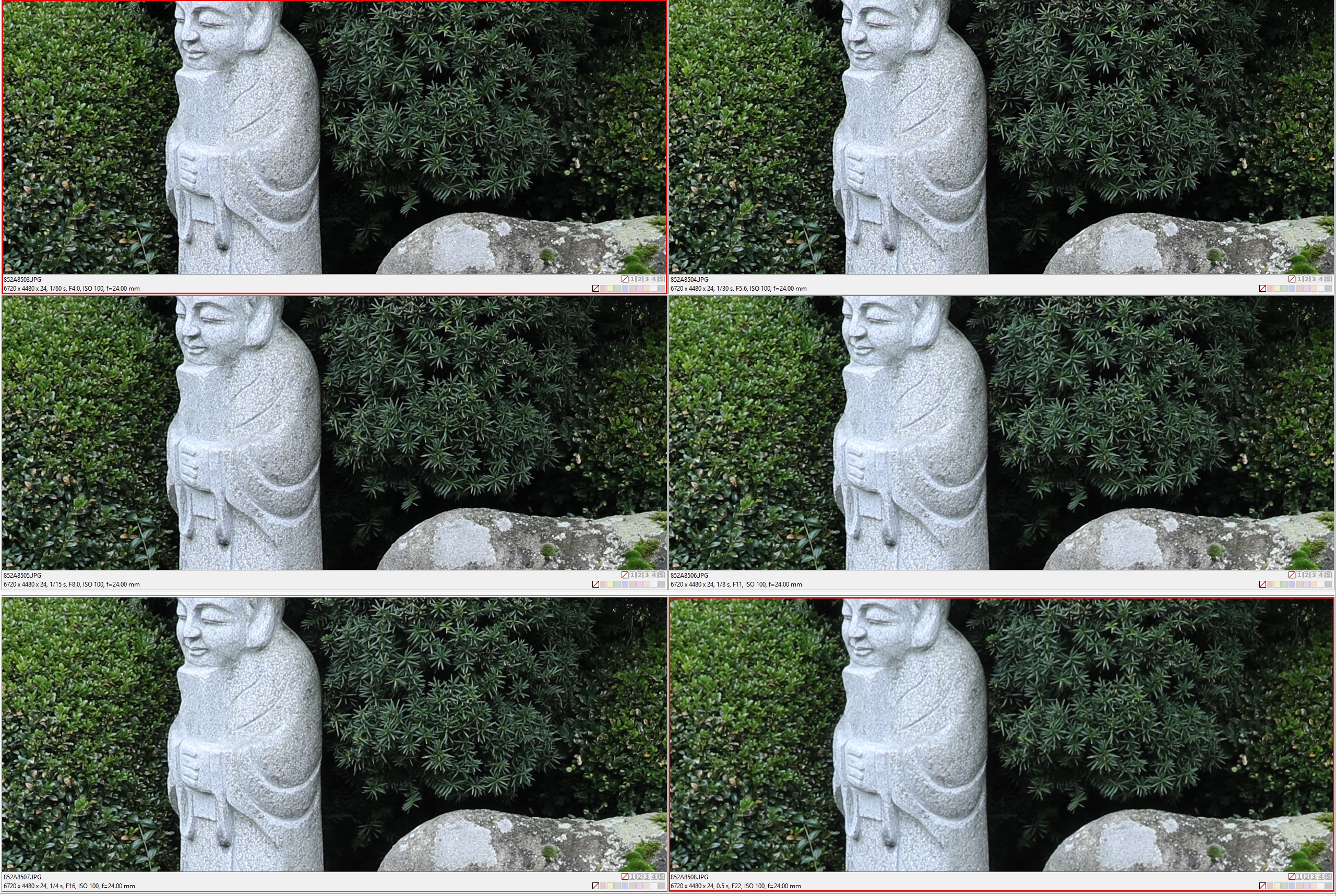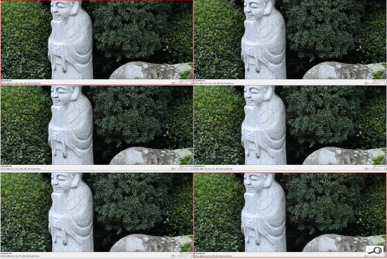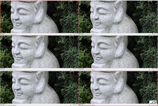 Pozoruhodná je vyrovnanost kresby. Není podstatný rozdíl mezi plnou světelností a optimem, jež nastává vždy na clonách kolem F5.6-8.0. Dokonce ani F22 není nijak extrémně zvadlá. Toto jsou ukázky 100% zvětšení při ohnisku 24 mm.