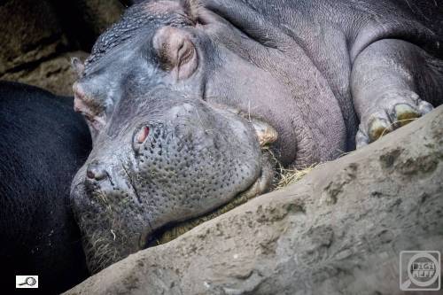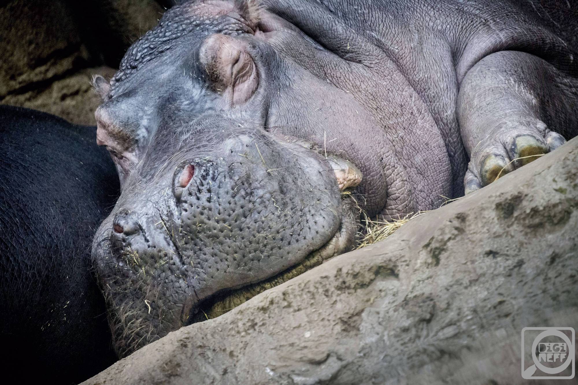 Mnoho zvířat vidíte za sklem. Tak jsem fotil i tohoto hrocha. Není divu, venku zima a hroch podřimoval v teplíčku. Mimochodem, v Africe byste obdobnou fotku získali jen s obrovskou dávkou štěstí, protože hroši tráví den ve svých bažinatých zahovněných hippo-poolech a na břehu se moc nevyskytují. Je dobře jít k tomu sklu co nejblíž, já byl doslova nalepený, kvůli reflexům. Sklo pochopitelně kresbě neprospěje, tak aspoň zaplaťpánbu, že takto. Náklon jsem tam dal, abych přidal trochu dynamiky. Ono to někdy pomáhá, nesmí se to přehánět, potkal jsem lidi, kteří jinak nefotili a to je pak… cesta po šikmé ploše do fotografických pekel.