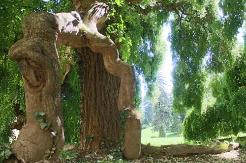 Jakmile je funkce zvolena, nelze použít expoziční kompenzaci. To může vyvolat problémy. Je sice hezké, že bude třikrát exponovat s různými hodnotami, ale může se stát, že se ani pak rozsahem expozice netrefíme. Zkoušel jsem to za opravdu extrémních podmínek. Ve valtickém zámeckém parku mají úžasný vzácný strom, převislý jerlín japonský. Jeho svislé větve vytvářejí něco jako pokojíček, do něhož se dá vstoupit, a průhledem mezi větvemi vidíme ven. Rozdíl v EV je – měřil jsem to – 6 EV. To by mělo být v pohodě, čtu o tom, jak ten či onen přístroj má rozsah 8 nebo dokonce 12 EV, pokládám to za čirou teorii, každopádně se s tím nedá počítat při focení do JPG formátu. Buď jsou slité stíny nebo přepálené jasy, ať nastavíte expozici jakkolii. HDR funkce je tedy dobré řešení. Když jí ale necháte volnou ruku v tak temném prostředí, jako je uvnitř toho jerlínu, dopadne to takto:
