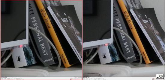 Kolem čtyřcestného voliče je nahoře tlačítko pro kompenzaci expozice, Q tlačítko, velmi užitečné, které fakticky nastaví na displej interaktivní dotykově ovladatelný stavový displej, eventuálně nastavuje scénické režimy. Z nich je zajímavé HDR, tedy složenina 3 různě exponovaných snímků světelně kontrastní scény, a pak Noční snímek z ruky, složenina 4 fotek s cílem eliminace šumu. Pozoruhodně to funguje, na ukázce máme vlevo sendvič, vpravo normální 3200 ISO.