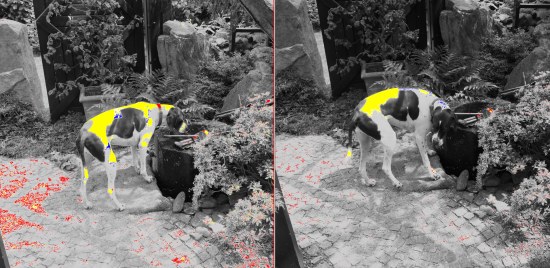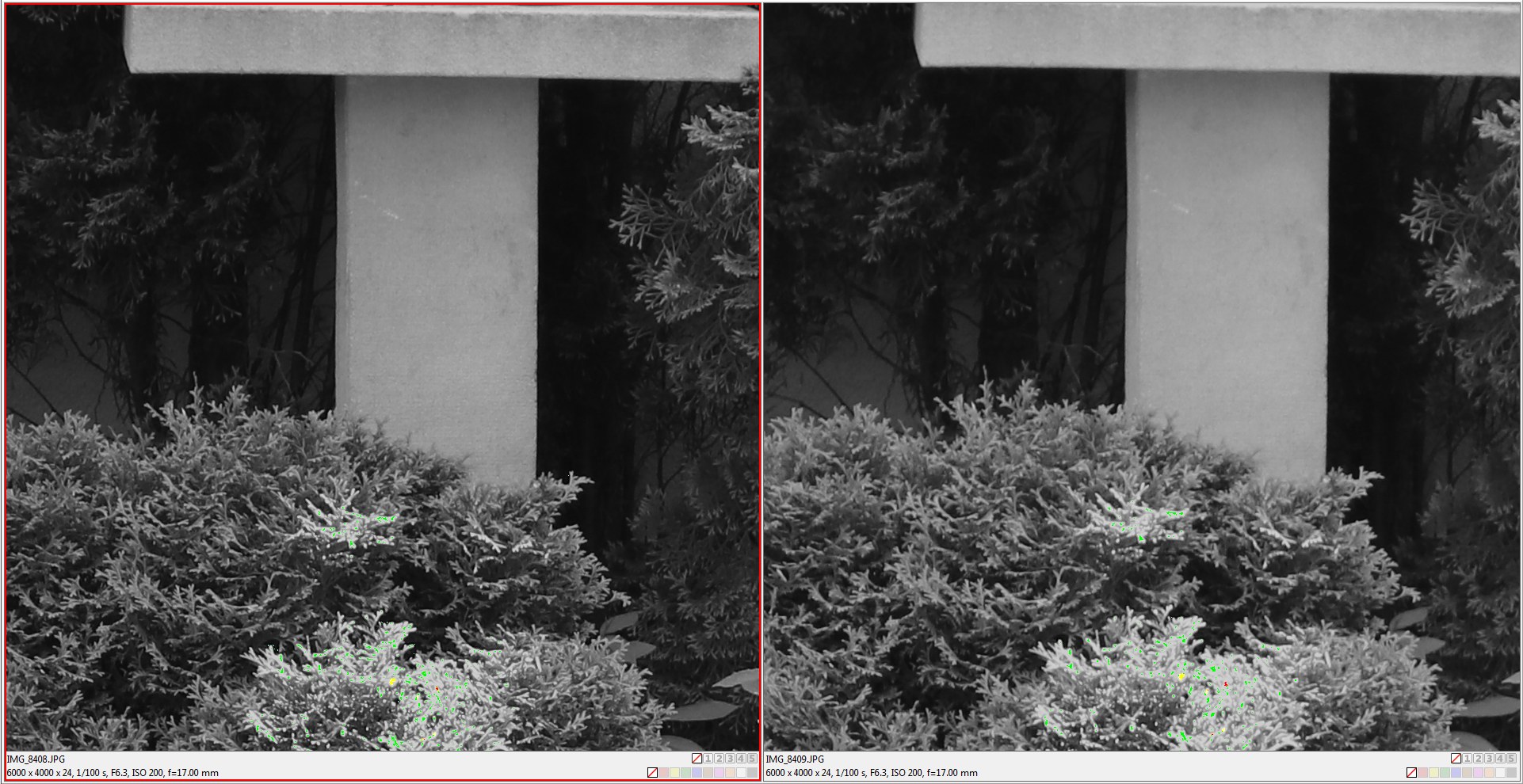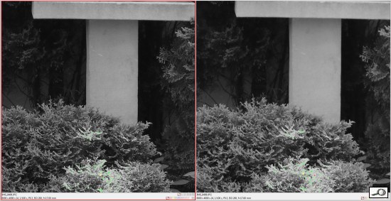 Pokud máme zapnutou prioritu, nelze nastavit Projasnění stínů, to je jiná funkce, snadno dosažitelná přes Q- menu. Jenom připomenu, že to co teď popisuju není žádná novinka, je to odvěká vlastnost zrcadlovek Canon. Tento model ale kreslí ve stínech tak dobře, že se rozdíl zapnutí a vypnutí funkce nedaří snadno demonstrovat, jen při velkém zvětšení vidíme jakýsi rozdíl, vlevo vypnuto, vpravo zapnuto: