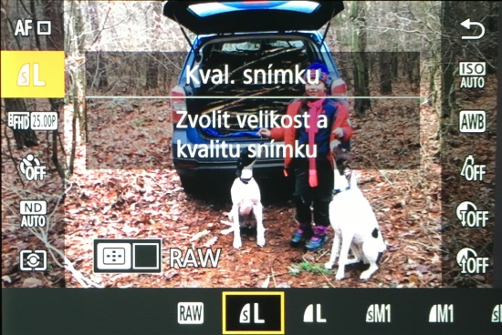 Na druhé straně od hledáčku je kruhový volič režimů. Pro zkušené je tu čtveřice P, Tv, Av a M, tedy program, priorita času a clony a plný manuál, dále pak pozice pro uživatelské nastavení, video, scénické režimy (přednastavené parametry pro rozmanité situace, zde najdeme HDR, rybí oko, černobílé snímání a podobně, je zde noční scéna z ruky = pořízení série snímků rychle po sobě a následné složení s minimem šumu. Funkce Kreativní snímek nabízí sérii fotek s efektovými filtry. Nechybí tu ani plný automat a dnes módní hybrid, tedy fotka s kratičkým videem.