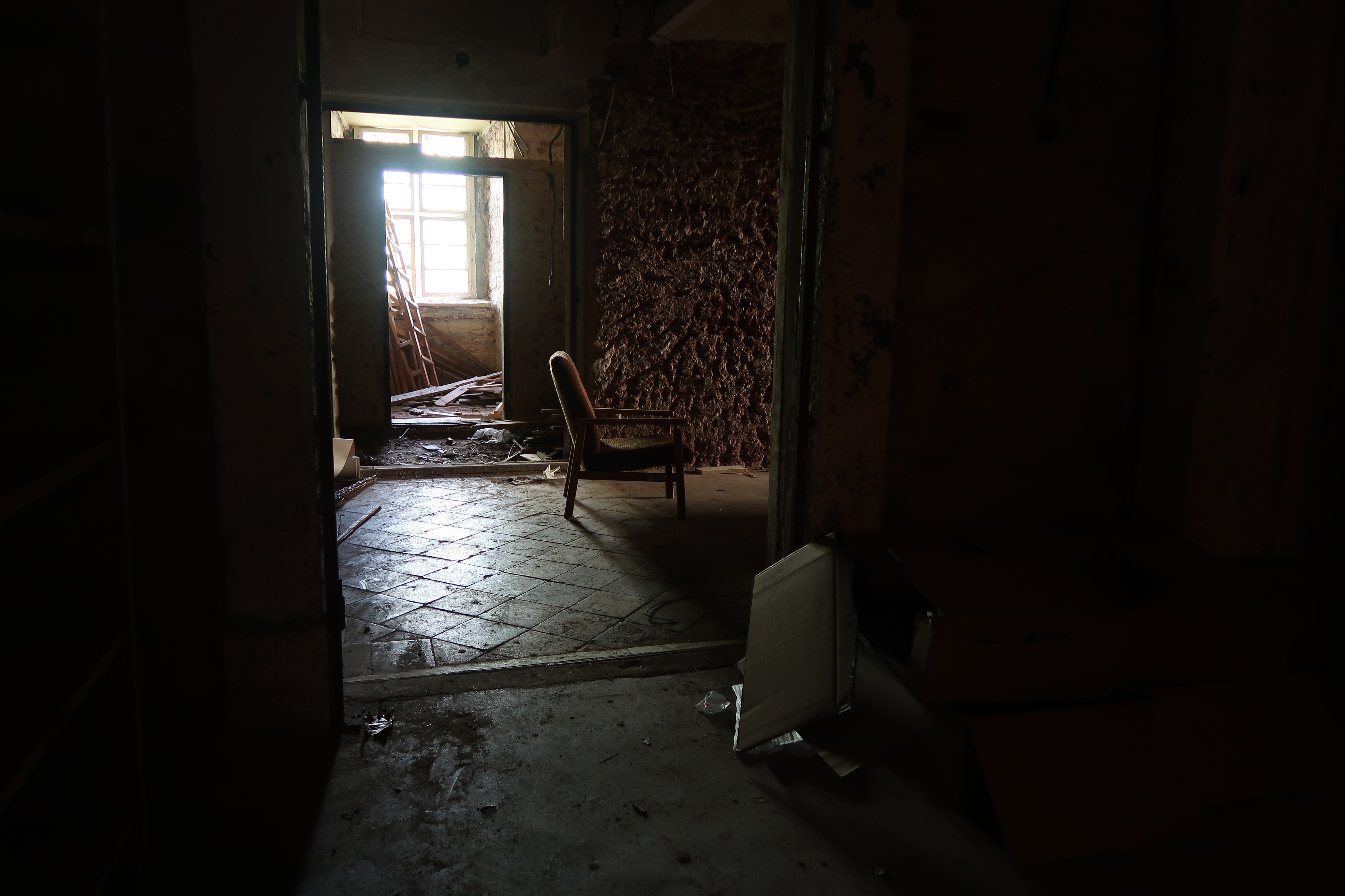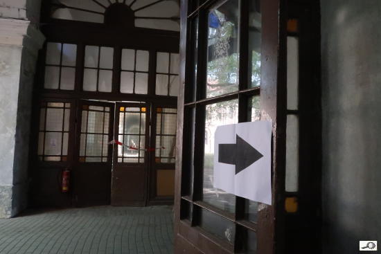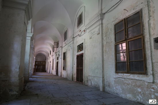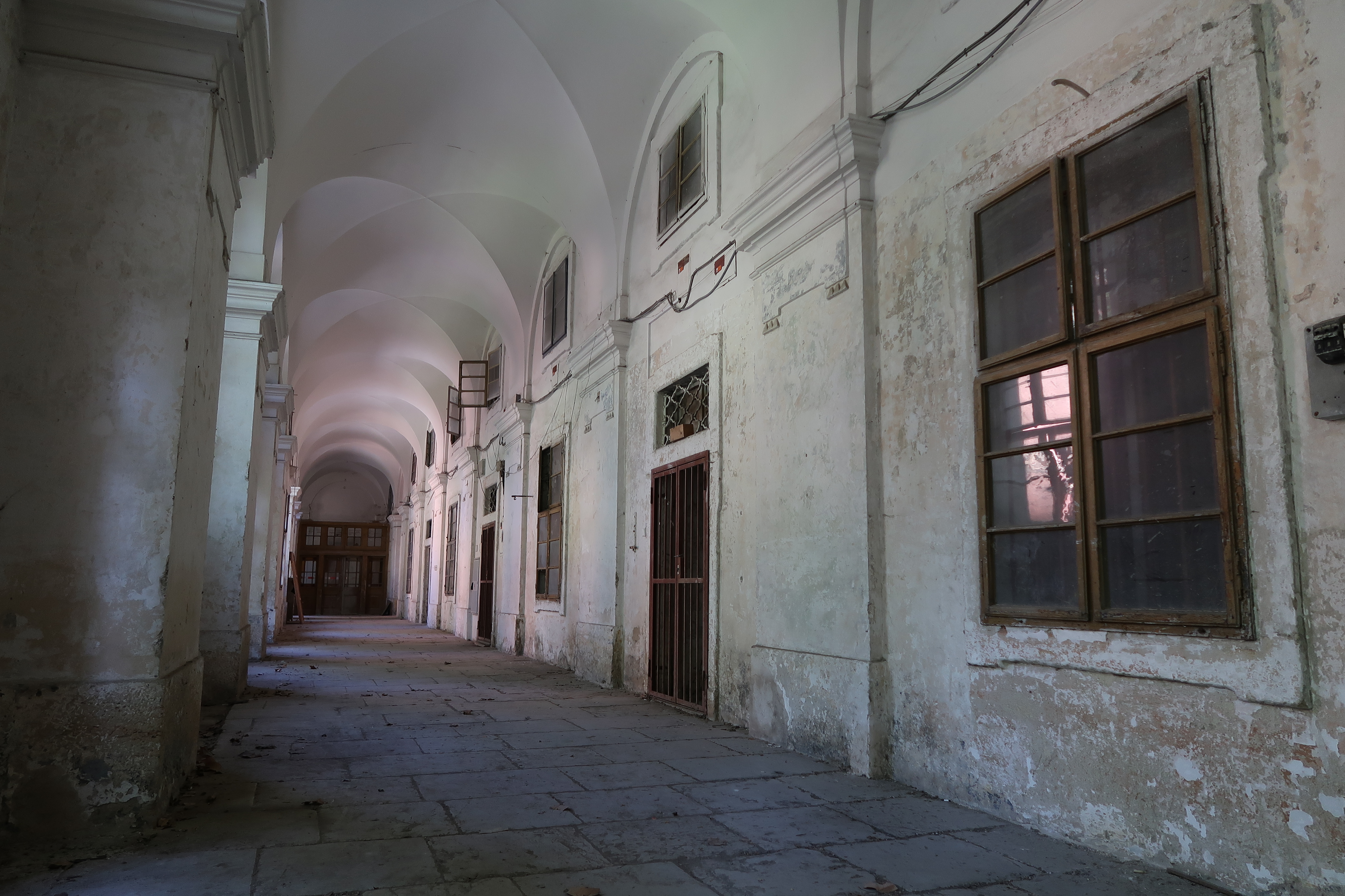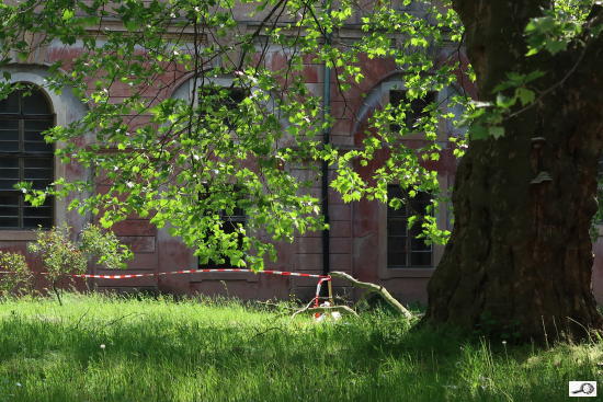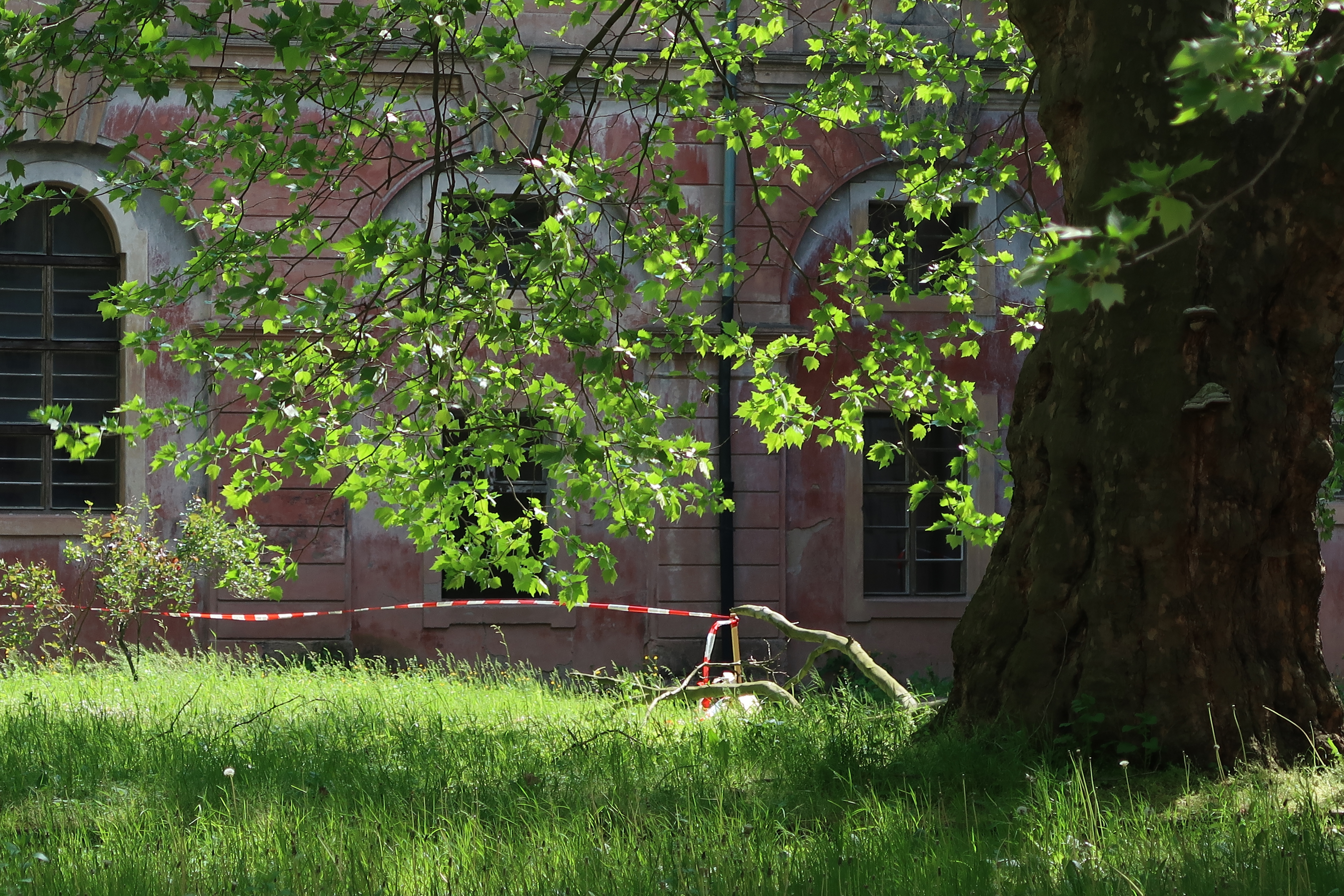 Jde o obrovskou budovu, původně určenou jako útulek pro lidi postižené válkou. Je, dejme tomu, hodně patinovaná, v přízemí postižená i povodněmi. Na nádvoří jsou nádherné platany, moc jsme se tam nesměli motat, hrozí úraz padajícími větvemi. První ukázka: protisvětlo, 1/80 na F2.8 na 125 ISO, korekce expozice -1,3.