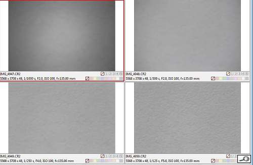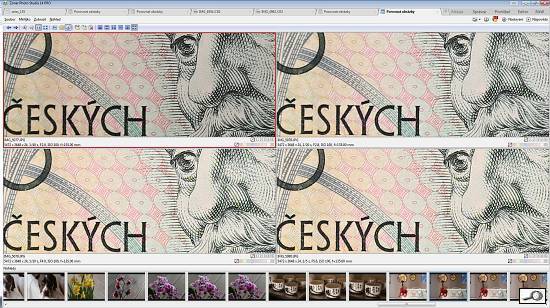 Nahoře je čtveřice v clonové řadě od 2.0 do 5.6, dole od 8.0 do 22., vždy z rohu obrázku.