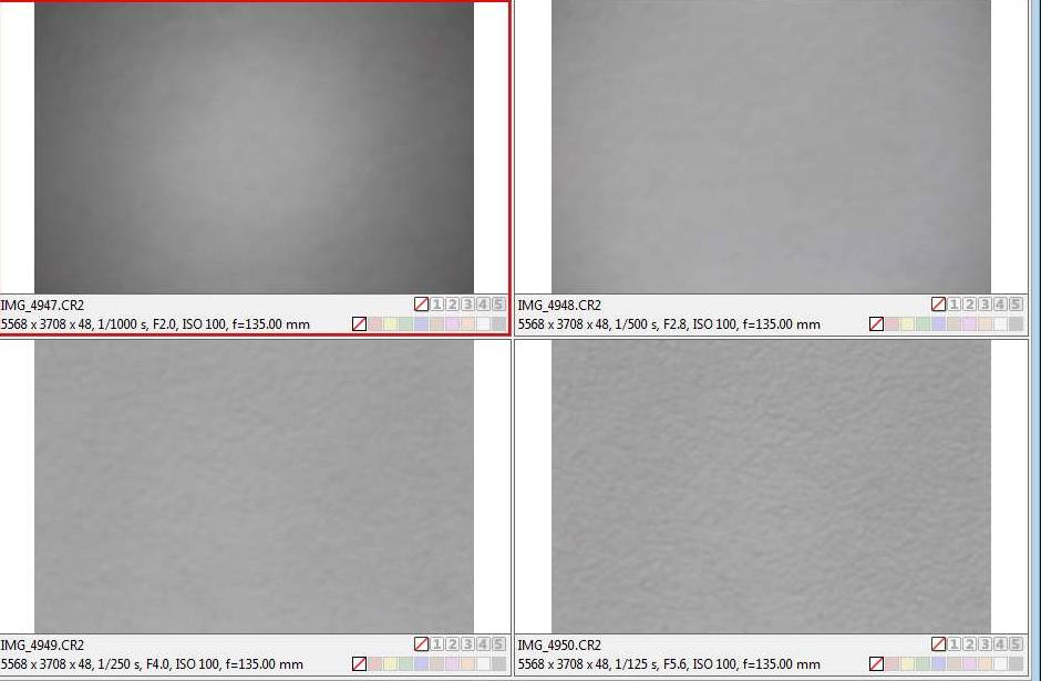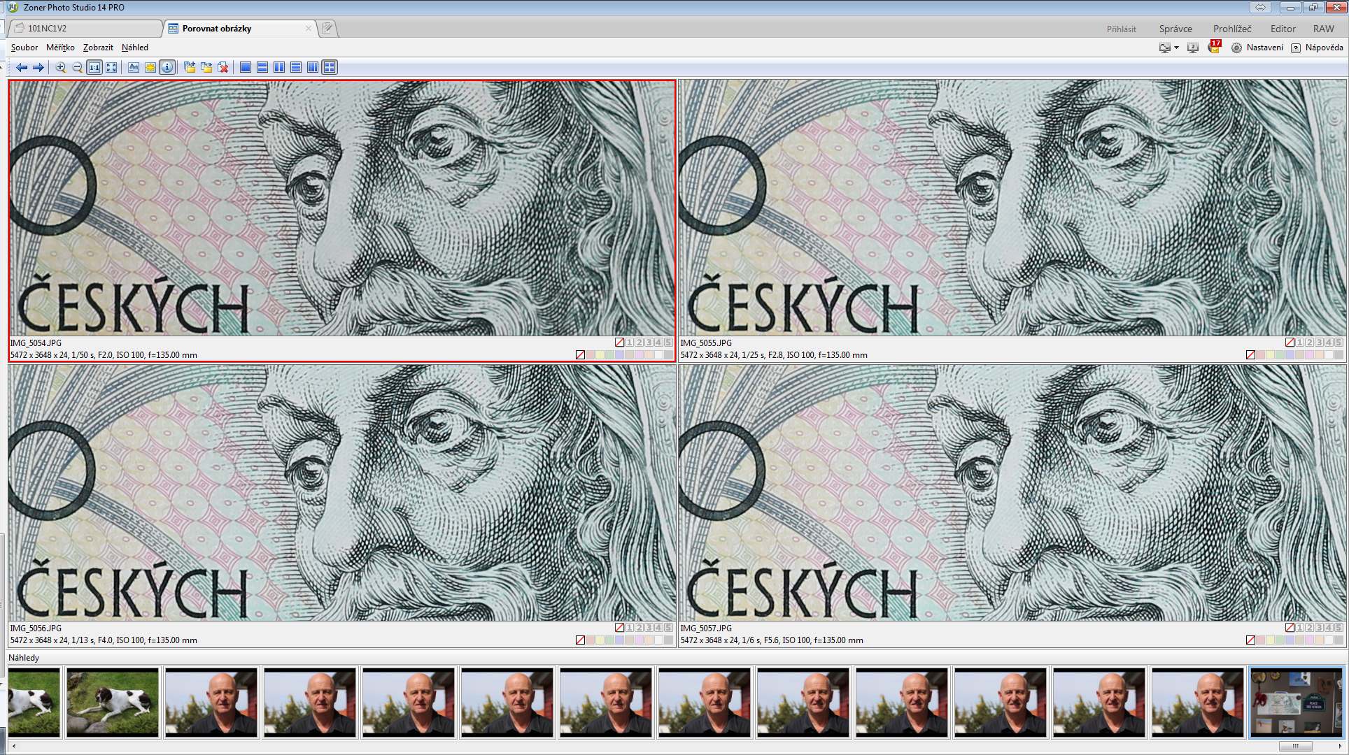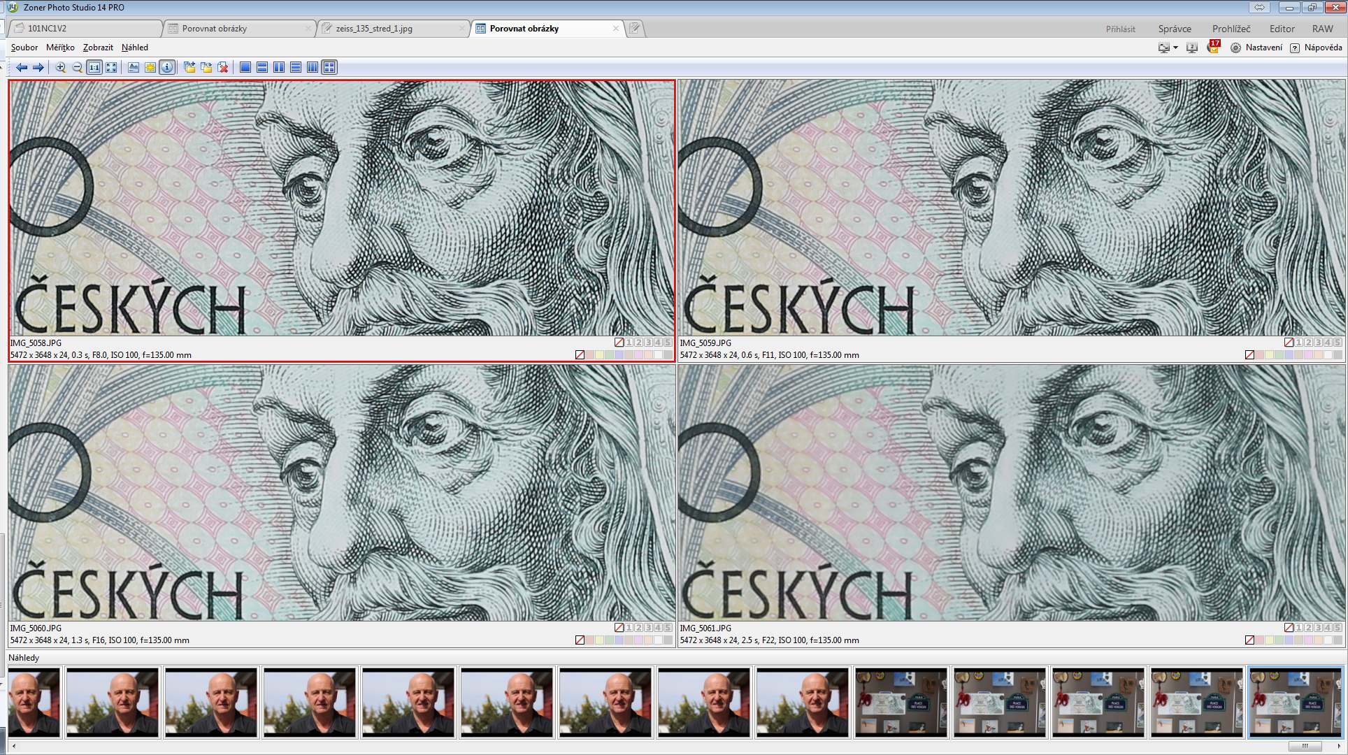 Nahoře je čtveřice v clonové řadě od 2.0 do 5.6, dole od 8.0 do 22., vždy z rohu obrázku.