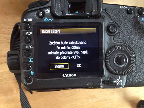 Funguje to takto – zde je příklad Canonu EOS 5D Mk II. Přístroj musí mít dobře nabitý akumulátor. V menu pak volíme Ruční čištění a po aktivaci OK se sklopí zrcátko a zůstane sklopené, dokud přístroj nevypneme.