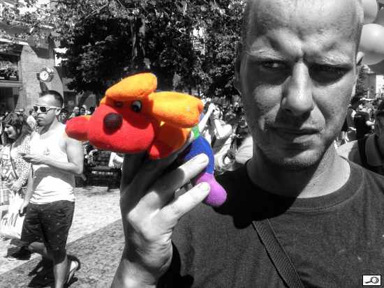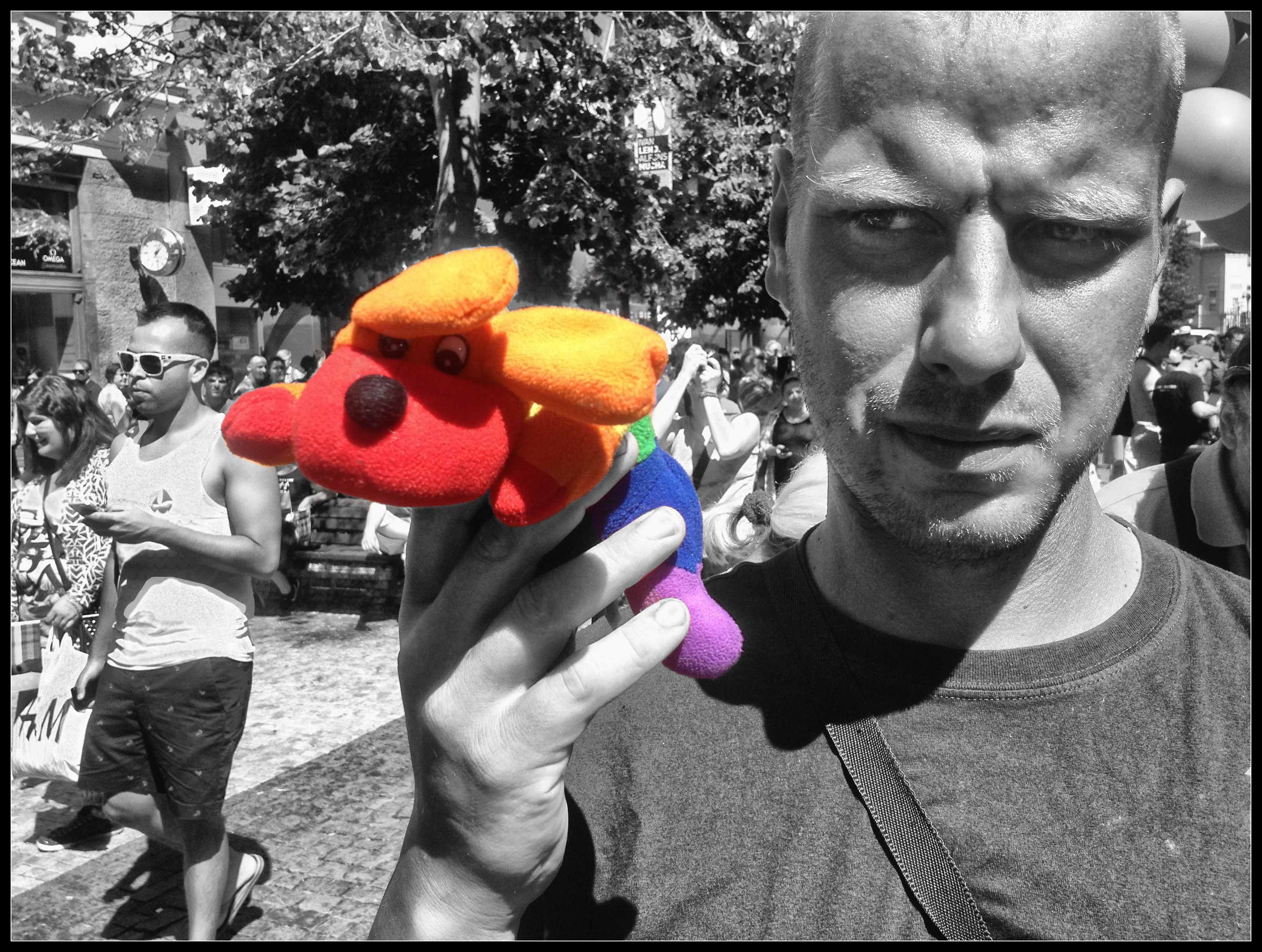 Částečnou barevnost jsem zvolil, když jsem svým iPhonem fotil průvod na poslední Prague Pride. Té barevnosti tam bylo až moc a řekl jsem si, že by částečná barevnost mohla vést k zajímavějšímu výsledku. Takže zrovna tahle fotka se mi docela líbí.