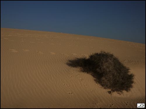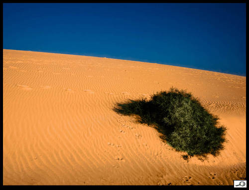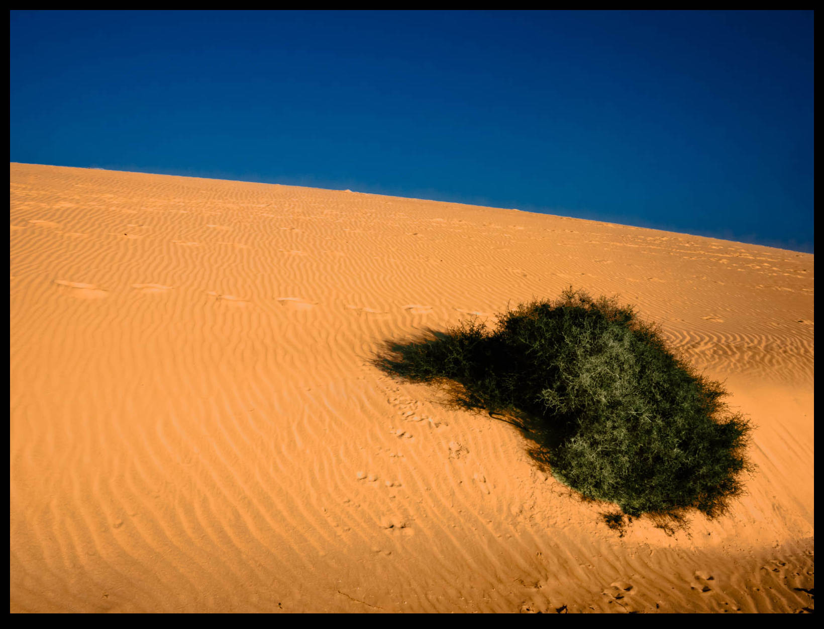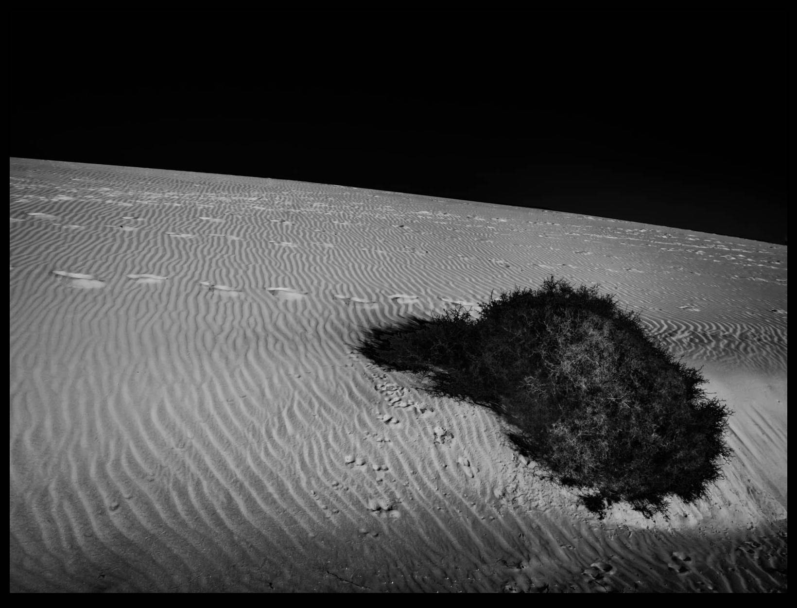 Tak tohle je barevná fotka, o tom není pochyb! Zaujalo mě to skromné zelené křovíčko vzdorující saharskému písku. Modrá obloha, písek ze Sahary a živořící vegetace, to jsou tři komponenty, vyjádřené barvami. A ta černobílá varianta?