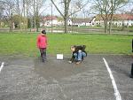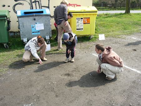 Tento snímek už je lepší, protože fotograf šel blíž a soustředil se na hlavní událost, tedy cvrnkání kuliček. Je to zřejmě nejzdařilejší snímek ze série. Nicméně: autor měl jít ještě blíž. V pozadí jsou dvě postavy, vzájemně se překrývají, jedna je zády, a navíc dva kontejnery na smetí. To vše strašně ruší. Je třeba myslet na pozadí. Vždycky lze najít takové stanoviště, aby v pozadí bylo co nejméně rušivých prvků. Navíc, použitý přístroj byl (dnes už letitý) Panasonic Lumix DMC-LC33. Ten má rozsah ohnisek ekv. 35 až 105 mm. Ta stopětka není žádný zázrak, ale pořád je to lepší, než nic, tedy, pořád je lepší si přizoomovat na 105 mm a zmírnit rušivé vlivy v pozadí, než jít na motiv s širokoúhlou “pětatřicítkou”.