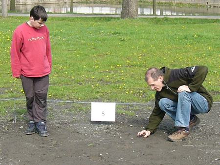 Princip “přibližování si můžeme ukázat na snímku, který v celé ploše, v náhledu, vidíme zde vpravo. Vidíme na něm dospělého závodníka, přihlíží chlapec. Už to je celkem zajímavý námět – dospělý hraje kuličky a kluk se na něho kouká. Hlavní aktéři zaujímají nepatrnou plochu v obraze. Přitom stačilo přizoomovat – i tento snímek byl pořízen ohniskem ekv. 35 mm. Zkusme si pohrát s výřezem: