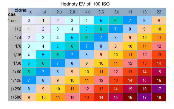 No a tenhle pevný faktor je základ toho čemu říkáme expoziční hodnota. Je to v podstatě množství odraženého světla. Je samozřejmě jiné někde ve sklepě, jiné v kuchyni u okna a jiné na fotbalovém hřišti za slunečného počasí. Abychom se v tom vyznali, musíme v tom udělat pořádek. Vytvoříme si tabulku expozičních hodnot. Stanovíme si pevnou, fixní citlivost a budeme zkoumat, jak se projevuje hodnota osvětlení na clonu a na čas. Platí úměra, že čím je vyšší expoziční hodnota (píšeme EV = exposition value), tím vyšší je světelná hladina (samozřejmě je to naopak, čím je vyšší hladina, tím píšeme vyšší číslo). Teď se podívejte na tabulku:
