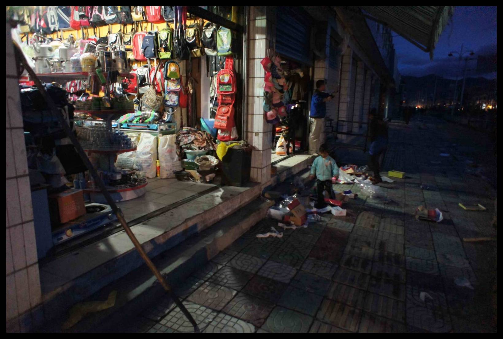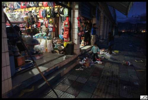 Bídně osvětlená ulice v malém čínském městečku