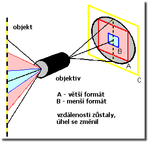 Na diagramu máme formát A (větší) a formát B (menší). Vzdálenost objektivu od objektu se nezměnila, stejná zůstala vzdálenost objektivu od promítací plochy. Co se ale změnilo je úhel záběru. Ten “modrý” je podstatně menší, tedy užší, než ten “červený”. A to je podstata “crop faktoru”.