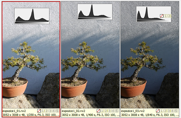 Zkusme tedy teorii prověřit praxí. Pořídil jsem tři snímky s roznou expozicí, s odstupem 2/3 EV: