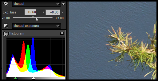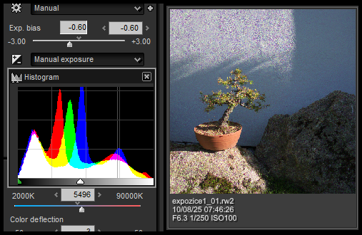 Druhý snímek (ten s kompenzací, připomenu, -2/3, tedy měl poměrně velkou kompenzaci, která ale vedla k ideálnímu histogramu bez přepalu, jenom vyvoláme bez úpravy. Třetí snímek s brutální kompenzací -1,3 EV zesvětlíme. Nepřekvapí nás, že dostaneme histogram do ideálního místa po zvýšení expozice… zase o tu “šedesátku”, tentokrát +60: