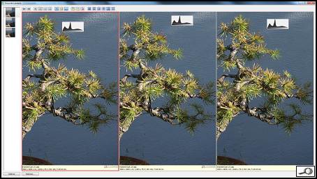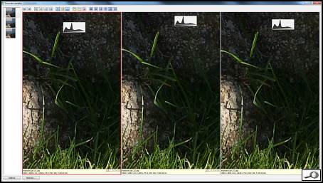 Teď máme tři vyvolané snímky, jeden ztmavovaný, jeden zůstal úpravou nedotčený a třetí zesvětlovaný. Podle teorie by ten první měl být nejlepší, měl by obsahovat nejvíc obrazové informace, kdežto ten zesvětlovaný by měl být zašuměný. Nuže, zkoumejme. Nejdříve datové objemy, ty snímky s větším počtem detailů jsou objemnější. Čili ten první, který by měl být nejlepší, po vyvolání má 5,7 MB, druhý má 5,6 MB a ten nejhorší 5,5 MB. Takže nějaké změny tu jsou, třebaže ne obrovské. Vizuálně, tedy na pohled, jsopu obrázky stejné. Když je srovnáme v Zoneru, při zvětšení na 100% v jasných partiích také nevidíme žádné rozdíly: