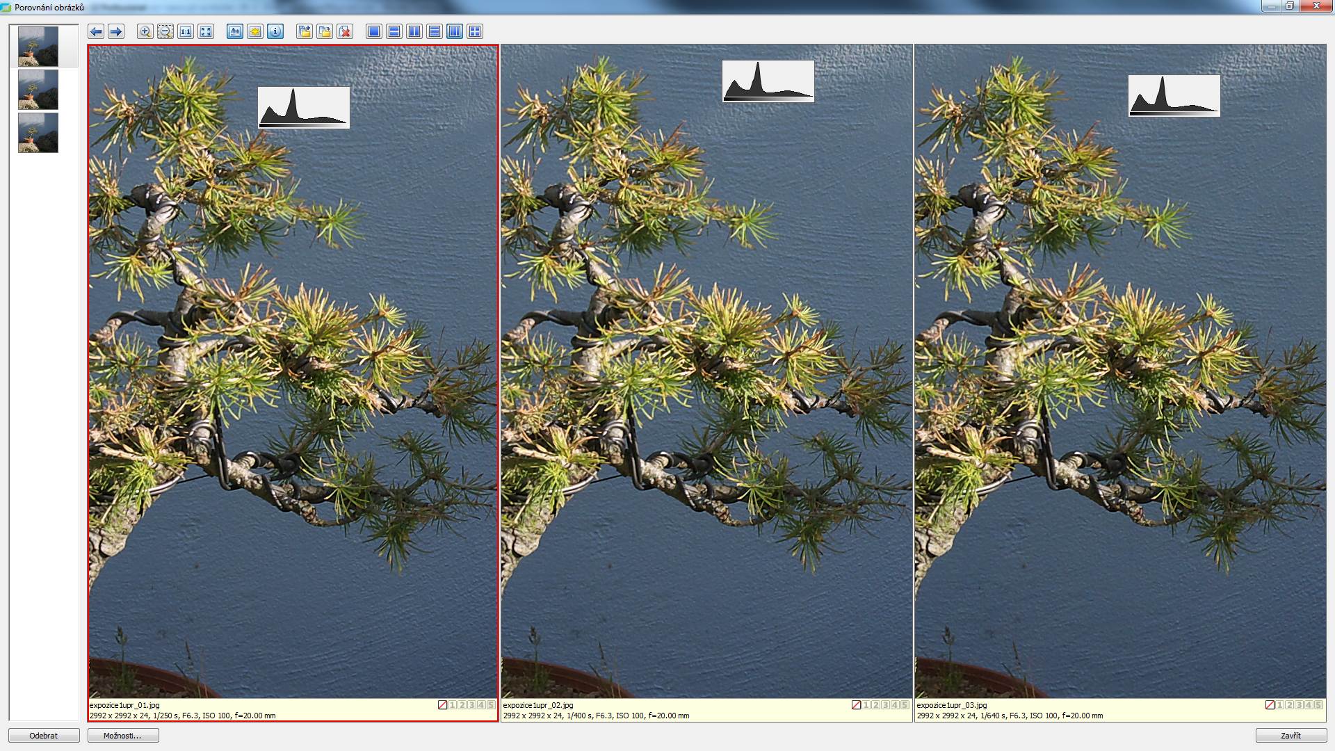 Teď máme tři vyvolané snímky, jeden ztmavovaný, jeden zůstal úpravou nedotčený a třetí zesvětlovaný. Podle teorie by ten první měl být nejlepší, měl by obsahovat nejvíc obrazové informace, kdežto ten zesvětlovaný by měl být zašuměný. Nuže, zkoumejme. Nejdříve datové objemy, ty snímky s větším počtem detailů jsou objemnější. Čili ten první, který by měl být nejlepší, po vyvolání má 5,7 MB, druhý má 5,6 MB a ten nejhorší 5,5 MB. Takže nějaké změny tu jsou, třebaže ne obrovské. Vizuálně, tedy na pohled, jsopu obrázky stejné. Když je srovnáme v Zoneru, při zvětšení na 100% v jasných partiích také nevidíme žádné rozdíly: