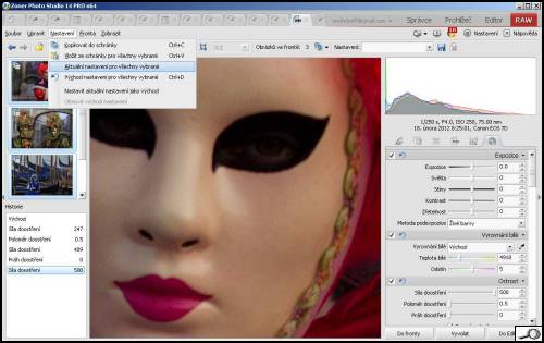 V dalším kroku udělám to, co zajímá našeho tazatele. Pod položkou roletového menu Nastavení zvolím Aktuální nastavení pro všechny vybrané. Z pohledu na menu vidíte, že jsem si mohl nastavení před tím (třeba včera nebo před týdnem) uložit a z uloženého aplikovat na vybrané – program je opravdu pružný a dovoluje toho hodně.