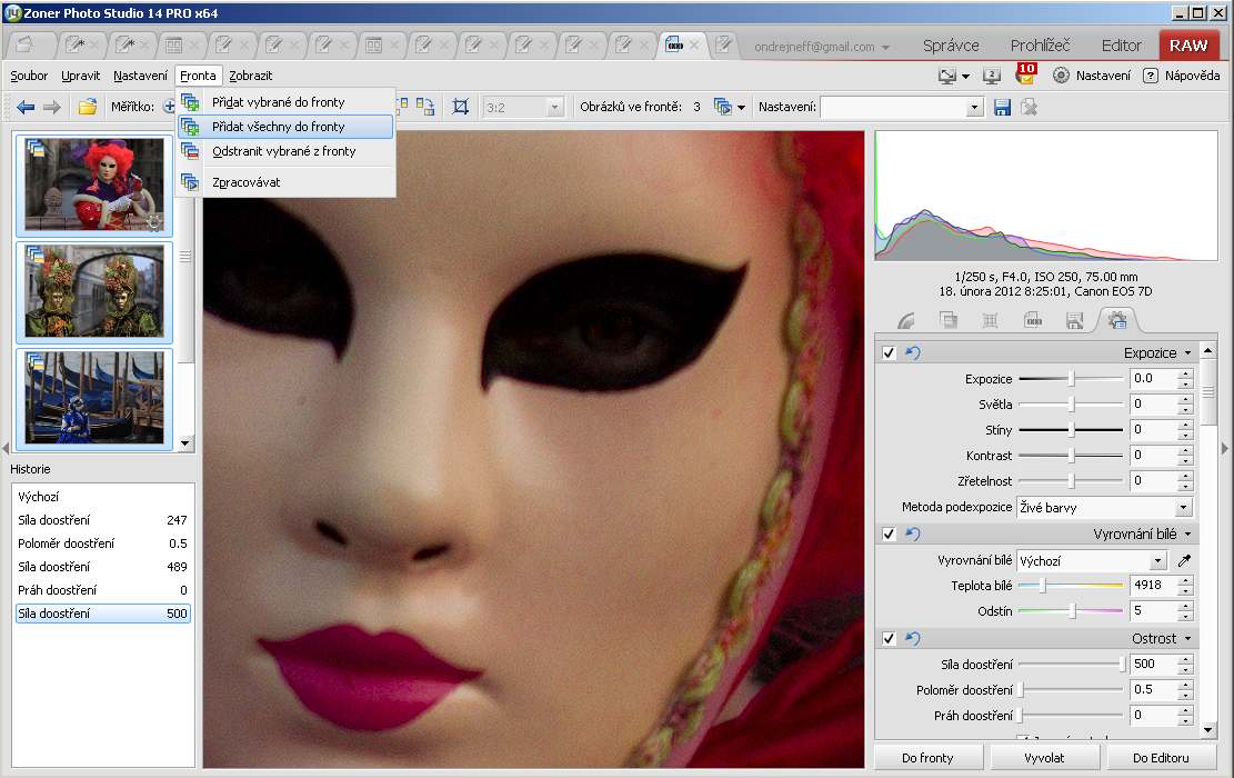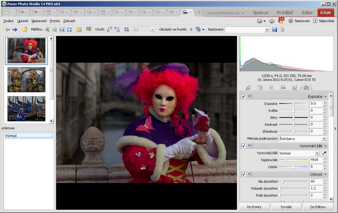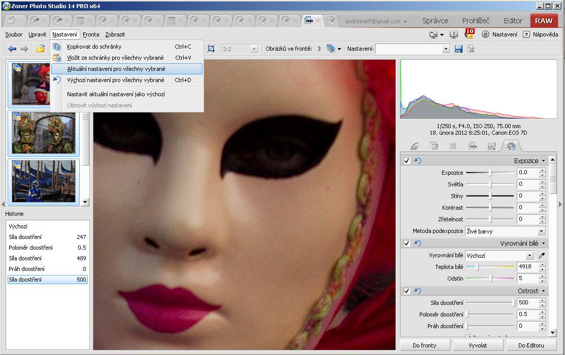 Dejme stranou, že podle mého názoru nemá dávkové zpracování 50 fotek moc velký smysl. Kouzlo RAW je v individuálním zpracování. Fotím s rozmyslem, mám představu o výsledku – a té představě přizpůsobím zpracování. Soudobé konvertory umožňují rozsáhlé celoplošné úpravy, a ty opravdu dobré dovolí i přechody, případně lokální úpravy. To ovšem chce individuální přístup, takže bych nejdřív rád panu Richterovi vkladl do srdce pochybnost o smyslu dávky – ostatně pochybuji i o smyslu focení souběžně v RAW a JPEG. Nicméně, pan Richter mi v dobré víře ve výsledek položil otázku a samozřejmě odpovím. Otázka se týká konvertoru v Zoneru, ale například v photoshopím Camera Raw se to dělá obdobně, ba dokonce jednodušeji a snadněji. Takže, první odpověď zní, ano, lze měnit jakékoli přednastavené hodnoty – jinak by to všechno ztrácelo jaksi smysl. Takže dejme tomu, že si zvolím tři fotky a ty budu naráz upravovat (může jich být třeba fakt těch padesát).