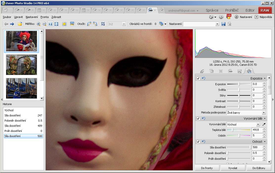 Nastavíme tedy Karbusického ostrost – v oddíle Historie vidíte, že se mi to podařilo až na třetí pokus, těch 500 jako síla doostření mi nešlo z prstů…