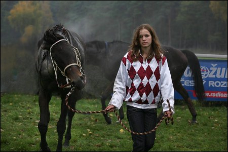 Já jsem si přece jen jednoho koníčka vyfotil, ještě se z něho v sychravém nedělním počasí kouří. A moc se mi líbí ta slečna, která ho vede. Příšerné jsou ty reklamy, které tam všude jsou! Jednu jsem vyzmizíkoval, na tu druhou jsem už neměl sílu, tak jsem aspoň zešedivěl písmo v úrovních stažením úrovně na výstupu.