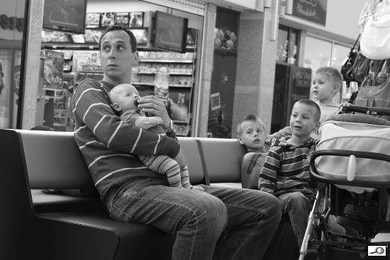 Stojí a padá na pohledech tatínka a čtyř ratolestí. Kromě mininka se všichni dívají s velkým zaujetím Jedním směrem. A opět jsme u příběhu. Kam se dívají? Co vyhlížejí? Asi maminku, která vrazila mimčo tátovi na klín a šla po svých? Pohledy zde vytvářejí osu fotky, vytvářejí pouta, která svazují celek dohromady.