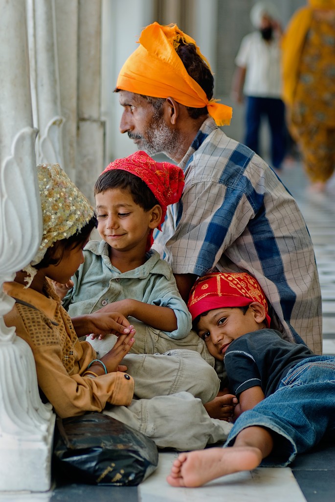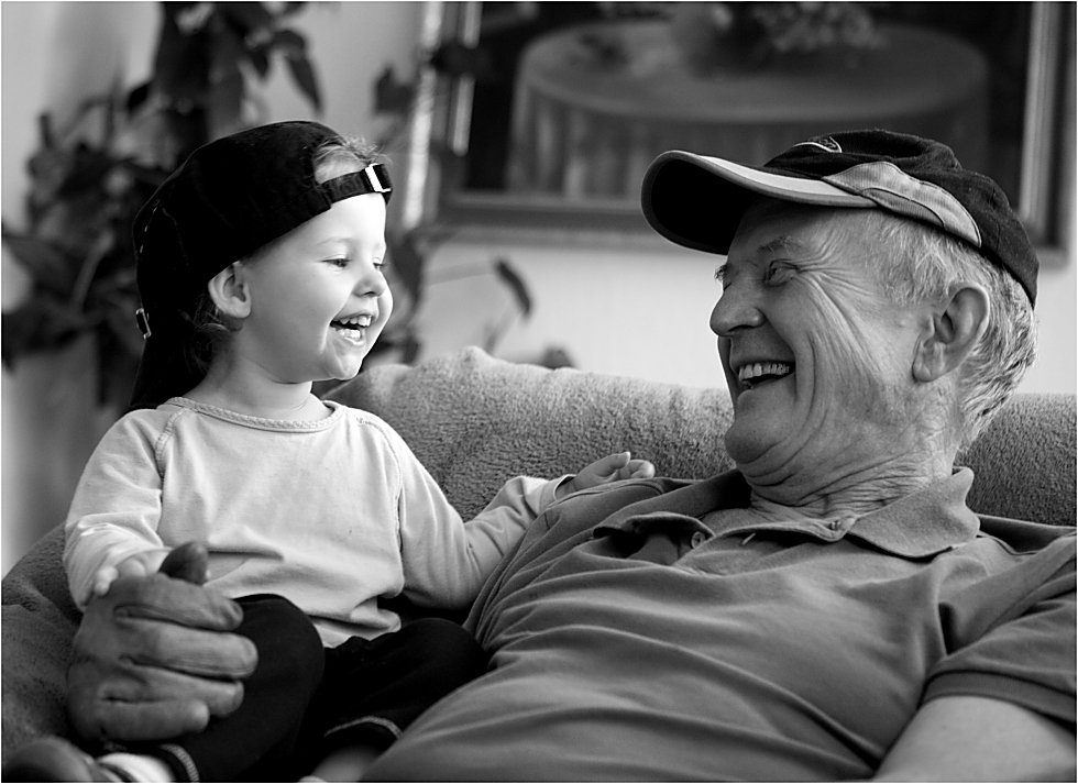 Takříkajíc na ní nic zvláštního není a skoro to vypadá jako fotka aranžovaná. Vsadil bych se, že není, jen to zkuste přimět dítě k tak bezprostřednímu úsměvu. Kompozice prozrazuje poučené oko a zkušenou ruku. Je tu mírný podhled, hlavy obou aktérů jsou dobře vsazeny na pozadí – samozřejmě že nejproblematičtější partie je ta bylina za hlavou dítěte, tmavá čepice skoro splývá s listím a zachraňuje to jen ten odlesk vzadu. Stěna za profilem dědečka (řekl bych…) je trochu prosvětlená, aby vynikl obličej ve stínu. No a dítě září jako sluníčko. Jsou to nepatrné zásahy do světelné situace a výsledkem je přirozená, příjemná fotografie.