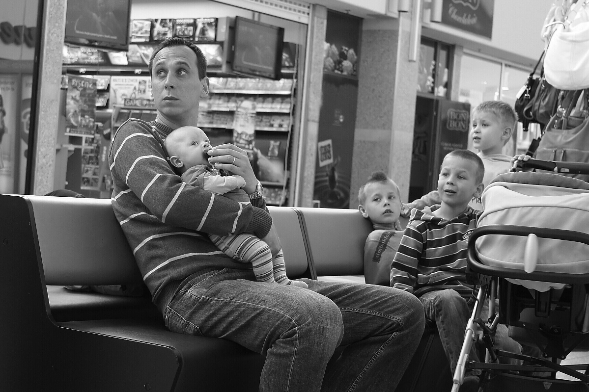 Stojí a padá na pohledech tatínka a čtyř ratolestí. Kromě mininka se všichni dívají s velkým zaujetím Jedním směrem. A opět jsme u příběhu. Kam se dívají? Co vyhlížejí? Asi maminku, která vrazila mimčo tátovi na klín a šla po svých? Pohledy zde vytvářejí osu fotky, vytvářejí pouta, která svazují celek dohromady.