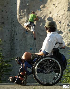 Příklad fotografie, kdy vůbec nevadí pohled zezadu – ani jednomu, ani druhému aktérovi snímku Luboše Hrona do obličeje nevidíme. Na kontrast nemusím upozorňovat, ten skutečně bije do očí. Taky se tu osvědčuje úsloví že v jednoduchosti je síla. Vozík je zabrán naprosto technicky, je o čistý bokorys jako z výkresu a pohled na lezeckou stěnu s borcem je jasný, čitelný. Výtku nemám žádnou, spíš povzdech: zastávám zásadu, že „dokud situace trvá, fotím“ a ten chlapík v zeleném tričku v nějakém momentu měl jistě nějaké výraznější gesto. Takhle vypadá, že na té stěně přebírá hrách. No a kdyby na té dramatičtější fotce vozíčkář se koukal jinam (což si myslím, že to tak nějak bylo), bez uzardění bych obě fotky zmontoval. Není to dokumentární snímek do novin, je to výtvarná fotka!