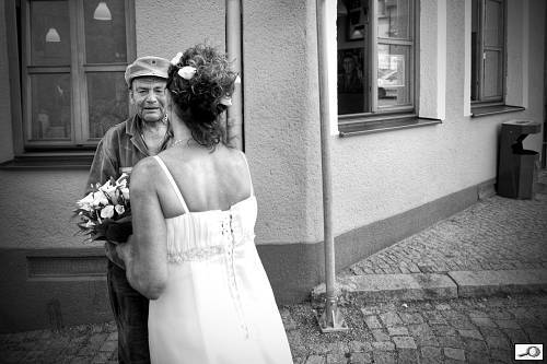 Libor Klímek také postavil svůj snímek Když se prolínají pocity na kontrastu dvou figur. Je to ale příklad fotky, kde se nesmí uříznout ani milimetr. Je to fotka svou povahou sociální – dáma viděná zezadu je pravděpodobně nevěsta, pravděpodobně věku zralejšího. Ten člověk asi ke svatbě nepatří, soudě podle oblečení a jeho tvář nezáří nadšením. Vše je zakotveno do hodně všedního prostředí, perfektně zachyceného. Vlevo nahoře lampy za oknem, vpravo koš, sloup dopravní značky nic neřeže… dokonale provedená věc. Formálně, kompozičně – silně asymetrické řešené, vše postavené na svislých liniích, diagonálu tu tvoří jen spodní okraj domu – i ta stačí vyvolat dojem prostoru. Technicky – přestože jde fakticky o statický snímek, autor volil 1000 ISO a 1/250 sec při ekv. 19 mm (podle příručky by stačila 1/20). A vyplatilo se – je to ostré!