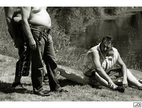 Kontrast do třetice, doslova dramatický. Roman Kuřimský vyfotil Vyčerpaného plavce a kecaly. Situace je jasná, pochopitelná na první pohled. Výraz v obličeji plavce i pupky obou kibiců vypovídají všechno potřebné. Naprosto nevadí, že obličeje kecalů nevidíme, určitě jsem o nic nepřišli a hlavně, jejich tělesné schránky mají velkou výpovědní hodnotu…