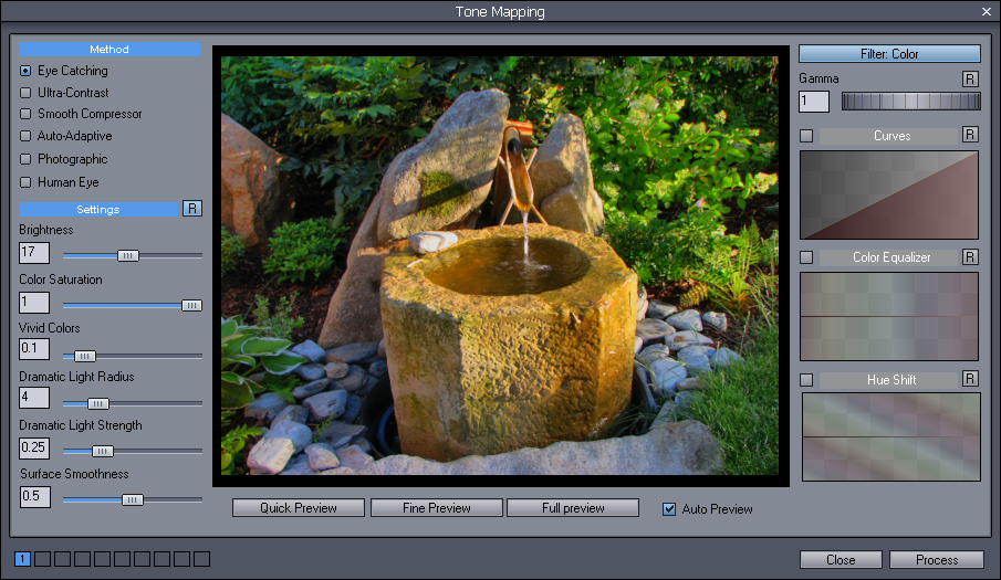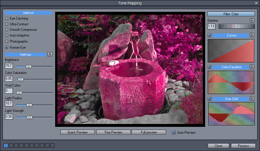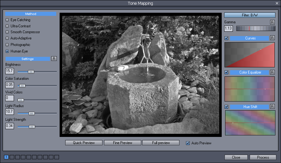 ![]() Vlevo nahoře je method, tedy volba režimu zpracování. Vždy se otevře metoda eye catching, tedy něco jako přitažlivá – je to vždycky barevně velmi živý obrázek. Na dotaz, proč to tak je bylo odpovězeno, že tak se to lidem nejčastěji líbí. Settings neboli nastavení této metody jsou ve výchozím postavení na této ukázce. Mému vkusu více vyhovuje stažená sytosti (color saturation a vivid colors). Pak už lze laborovat s dramatic light – to je v podstatě kontrast v rámci jasových oblastí, na př. kontrast ve stínech a kontrast ve světlech. Při laborování s touto položkou se mění síla černého rámečku kolem obrázku, to je zřejmě chybka této verze softwaru. Další možnosti jsou “ultra contrast”, lze použít i ostatní, zajímavé jsou všechny a někomu může vyhovět podle jeho vkusu kterýkoli z nich. Mně ale připadá ta “eye catching” metoda dostatečně pružná. Výsledný obrázek lze dále filtrovat pomůckami vpravo. Tam lze tmavost dolaďovat nastavením středního bodu (gamma), ale také ve křivkách – to mi připadá trochu zbytečné, protože pomocí HDR jsme pracně rozšířili dynamický rozsah a bylo by zbytečné ho teď zužovat zvýrazněním stínů. Color equalizer a hue shift slouží k barevným efektům, například takovým: