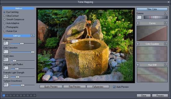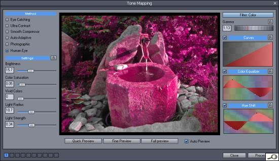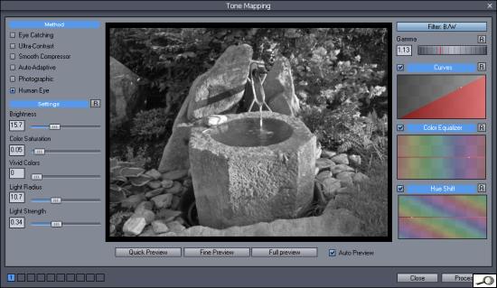 V prvním díle tohoto článku jsme si vysvětlili, k čemu je třeba rozšiřovat dynamický rozsah fotografie a začali jsme se seznamovat s programem od firmy Mediachance. Dnes prohlídku dokončíme. Tone mapping je další důležitý pojem tohoto procesu. Je to fakticky plošná editace obrazu. Obrázek lze jednoduše upravovat podle dvou malých náhledů v levé části pracovní plochy, ale lépe je otevřít funkci tone mapping poklepáním na modrou ikonu s okem. Pak se otevře toto okno: