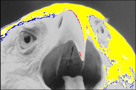 Aby bylo jasnější, co je a co není přepal, zvýrazníme si přepaly v Zoner Photo Studiu: celkový přepal je žlutý, modré skvrny označují přepal v modrém kanálu. Zajímají nás celkové tedy žluté přepaly: