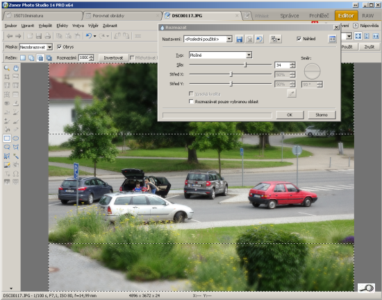 Ono to ale má limity, dělal jsem s tím pokusy a nejlépe je nastavit rozmazání odpovídající 7% výšky obrázku. Zde je to cca 3500 bodů výška, takže rozmazání 200 bodů je tak akorát. Výběr nastavím na Odebrat z výběru a udělám pruh. Je dobře dát do výběru jen ta autíčka, to pak působí nejvěrohodněji:
