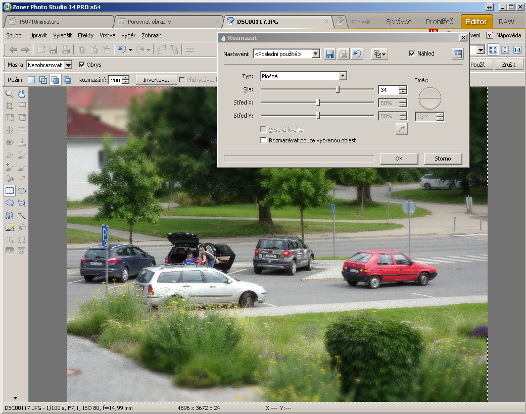 Ono to ale má limity, dělal jsem s tím pokusy a nejlépe je nastavit rozmazání odpovídající 7% výšky obrázku. Zde je to cca 3500 bodů výška, takže rozmazání 200 bodů je tak akorát. Výběr nastavím na Odebrat z výběru a udělám pruh. Je dobře dát do výběru jen ta autíčka, to pak působí nejvěrohodněji:
