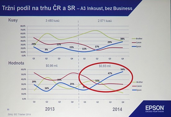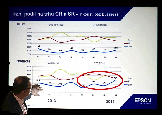 V segmentu tiskáren A, jako je právě ta L1800, se dostal Epson na vedoucí pozici a má 56% zastoupení na trhu. Mimochodem, mám v testu Sonyho A7 II a ten graf jsem vyfotil z promítacího plátna z ruky ze svého sedadla v poslední řadě.