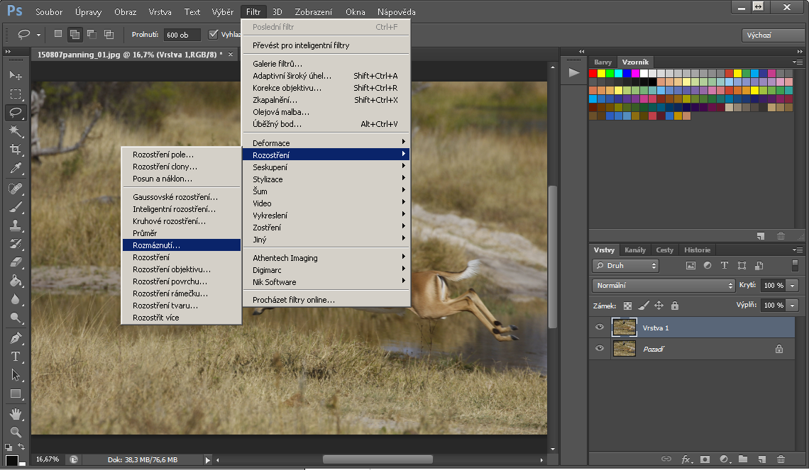 Asi všichni víme, čemu se říká panning – sledujeme fotoaparátem rychle se pohybující objekt. Když pánbu dá, objekt bude ostrý a pozadí mázlé. Když pánbu nedá, což obvykle nedá, je mázlé všechno. Anebo je všechno naopak ostré a to taky není dobře. Podívejte se na ukázku. Zachytil jsem antilopu se všemi čtyřmi ve vzduchu, to se stává málokdy, obvykle má jednu nohu na zemi. Je to focené tisícinou a ostré je i zvíře, i tráva pod ním. Fotky si můžete stáhnout, abyste si to mohli zkusit sami.