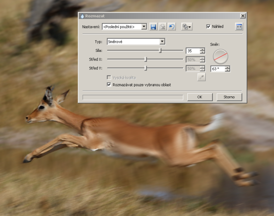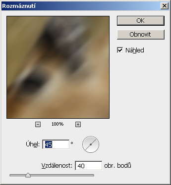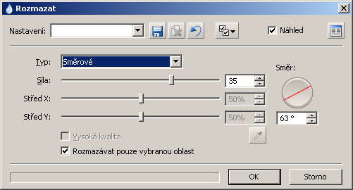 V dialogovém oknu volím směr rozmáznutí a jeho sílu. Logicky by mělo jít napříč, ale zde je to méně efektní, volil jsem tedy jiný úhel.