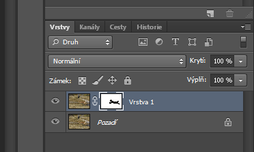 V poslední fázi dám zvíře do výběru a nastavím na mázlou vrstvu masku s klávesou Alt, tím vznikne maska, která mi zakryje vnitřek výběru a odkryje to co je vně (defaultně se odkrývá to co je uvnitř výběru).